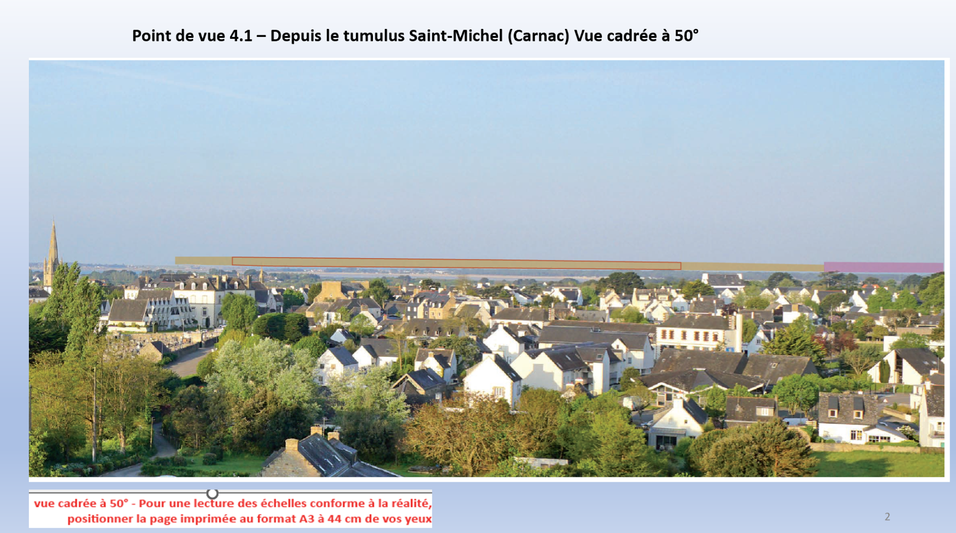 « En retrait du littoral, les vues à distance sur l'Atlantique sont très rares. Celle offerte par le sommet du tumulus de la chapelle Saint-Michel, à Carnac, est d'autant plus précieuse…En matière de patrimoine protégé, deux sites mégalithiques sont exposés à des perceptions de la Zone d'Implantation du Parc Bretagne sud : le tumulus de la chapelle Saint-Michel à Carnac, qui est également un belvédère sur Carnac et le paysage maritime ; le cairn de Petit Mont »....