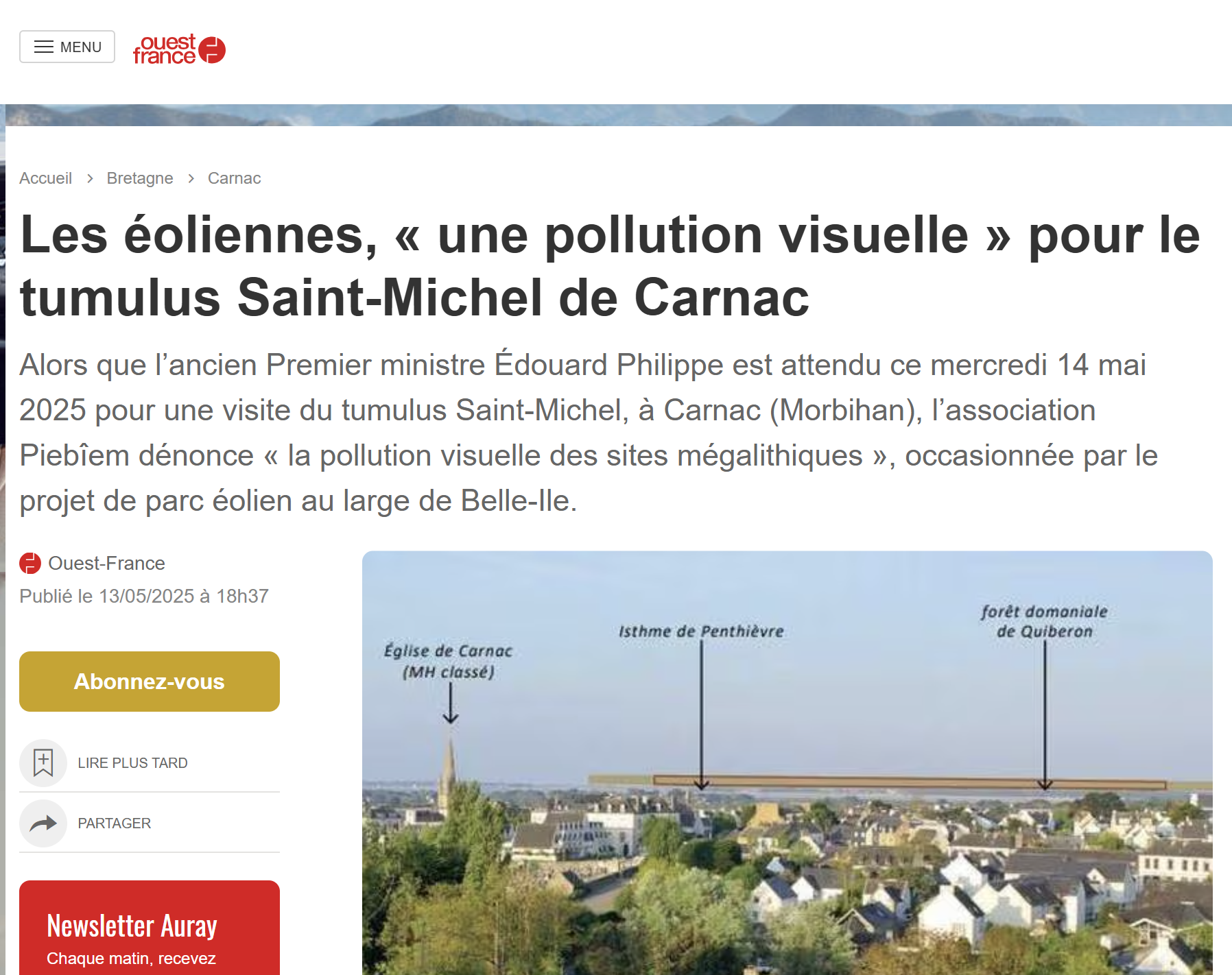 CP PIEBÎEM 13/05/2025 : Déplacement d'Edouard Philippe à Carnac : PIEBÎEM dénonce la pollution visuelle des sites mégalithiques par la zone industrielle éolienne en mer Bretagne sud et l'atterrage sous le champ de menhirs d'Erdeven