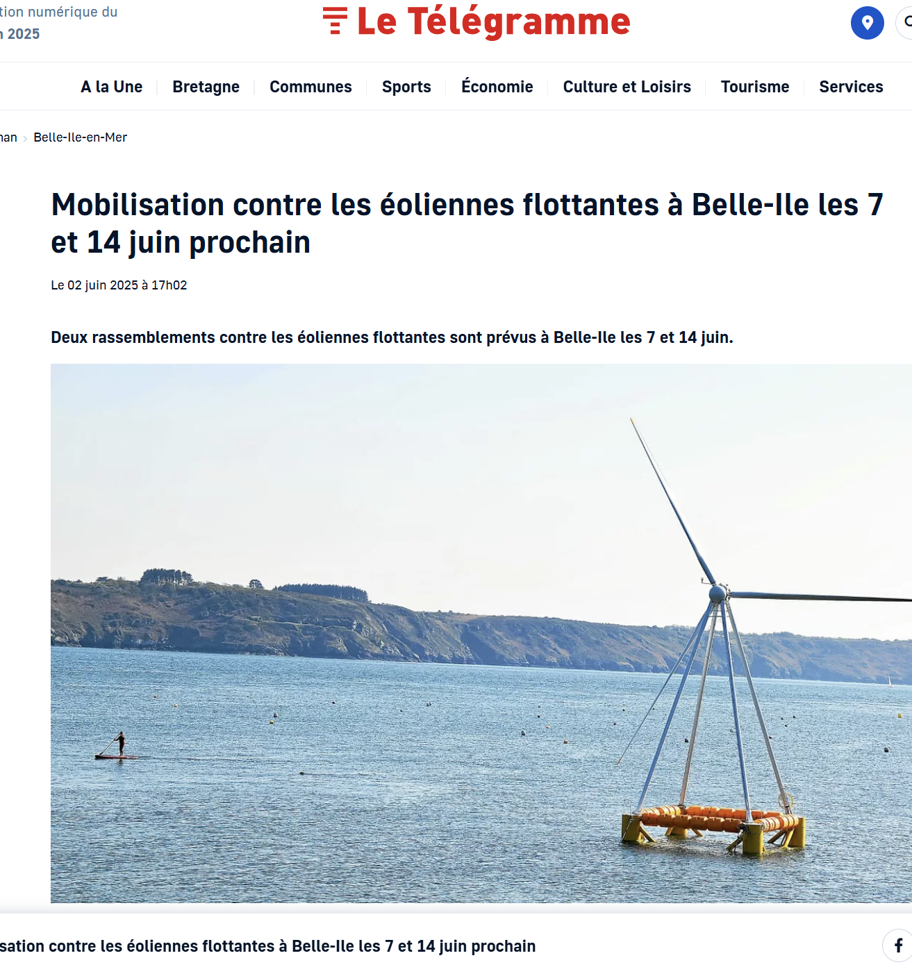 Projets d'éoliennes flottantes à Belle-Île : Deux associations organisent des rassemblements les : 7 et 14 juin 2025. A l'annonce de la venue à Belle-Île du consortium PENNAVEL, promoteur de la première phase d'implantation d'éoliennes flottantes industrielles au large de nos côtes, les associations locales LE GENIE DU LIEU et PIEBÎEM souhaitent réaffirmer leur opposition à ce projet dévastateur. Nous invitons à cette occasion les Belliloises et les Bellilois soucieux de la préservation de la biodiversité et des paysages, à nous rejoindre lors de ces deux rassemblements prévus : ⁃ Samedi 7 juin à Sauzon, proche de la salle des expositions de la Mairie à partir de : 14H30'. ⁃ Samedi 14 juin à Bangor, proche de la salle polyvalente communale à partir de : 14H30'.... CP en pièces jointes