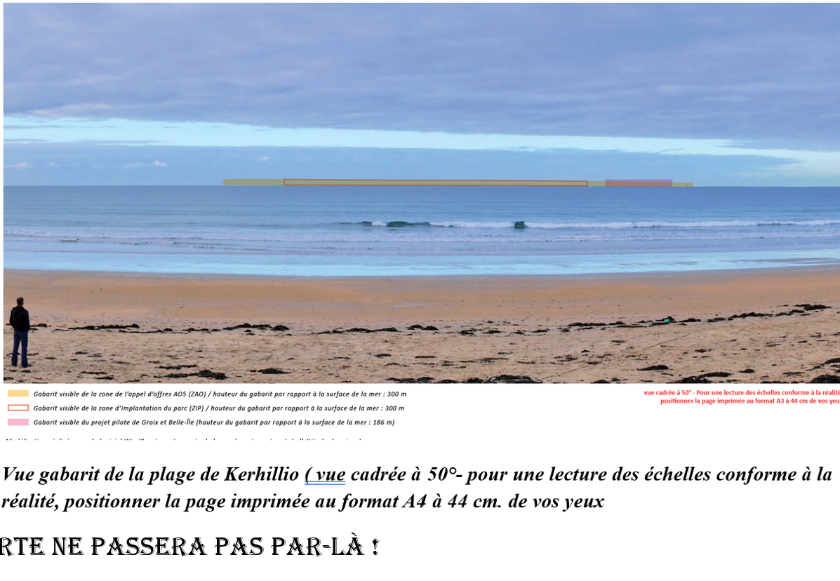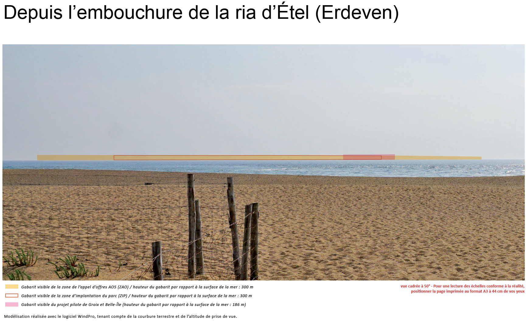 60 éoliennes flottantes de 260 à 300 m de haut entre Groix et Belle Île en Mer , ~ 4 fois la hauteur du point culminant de Belle Île en Mer ; 1,5 fois sa surface 19 km de la côte la plus proche pour une moyenne européenne de plus de 40 km, Poste en mer, Atterrage plage de Kerhillio, passage sous les menhirs d'Erdeven...