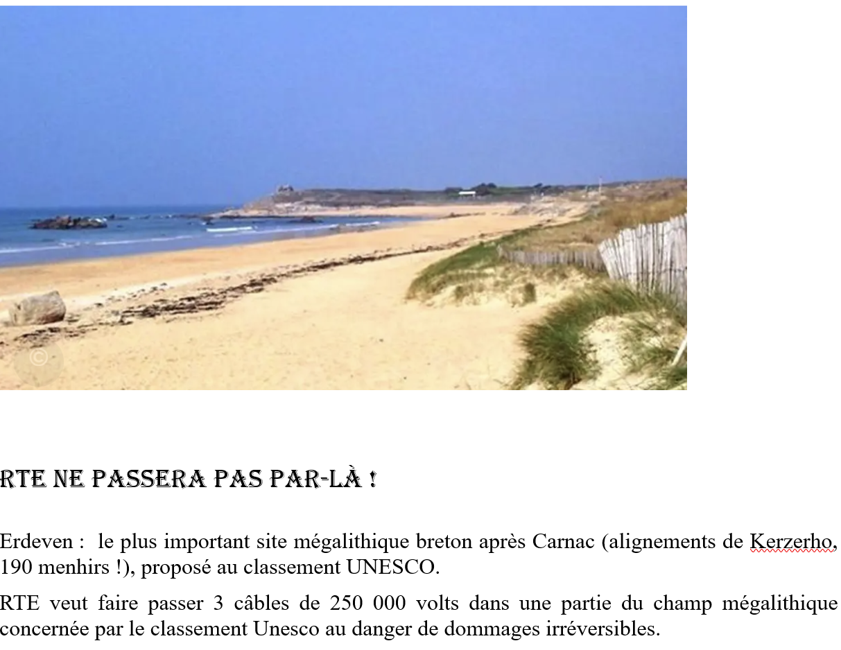 En liaison depuis longtemps avec « Sites et Monuments », nous nous félicitons donc de l'action menée sous l'égide de cette association contre des forages et carottages en aveugles, sans mesures d'archéologie préventive...RTE semble manifester une surdité totale quant aux conséquences de ces projets éoliens sur les paysages, sur la biodiversité, sur le patrimoine, sur les activités traditionnelles dont la pêche.