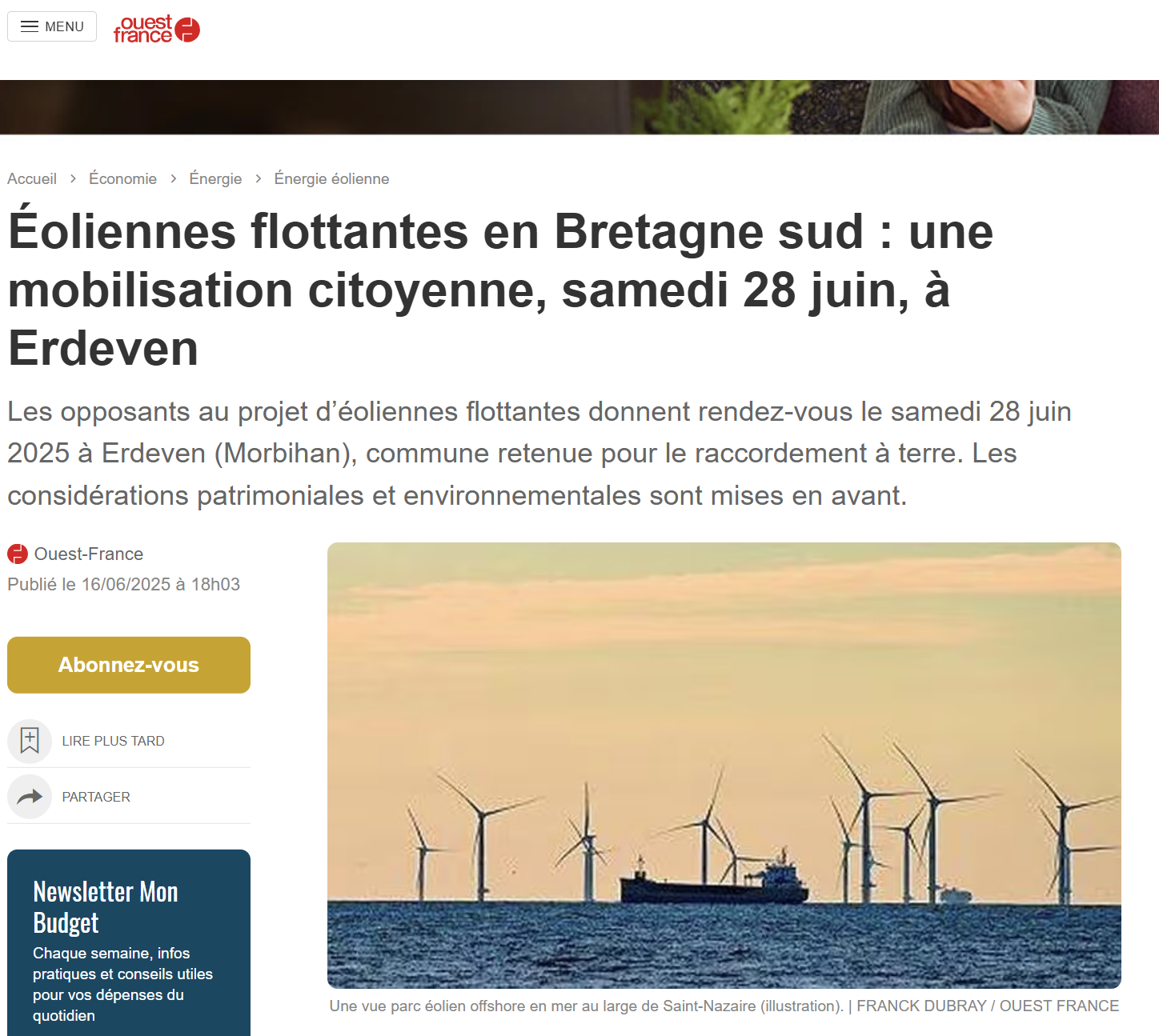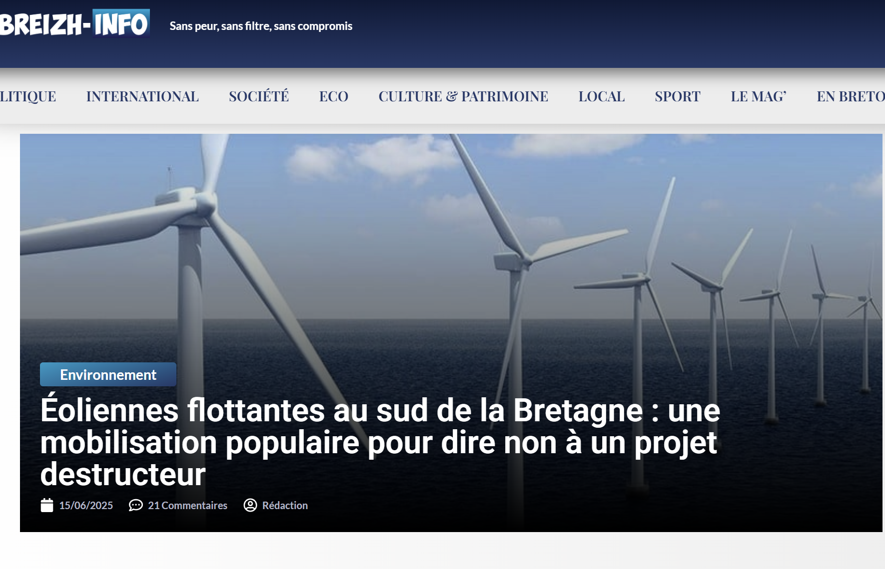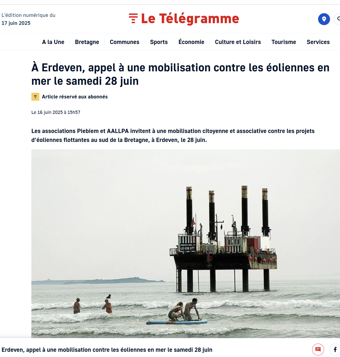 CP PIEBÎEM-AALLPA -25 juin 2025- Projets d'éoliennes flottantes au Sud de la Bretagne : Une mobilisation citoyenne et associative le samedi 28 juin 2025 à Erdeven pour demander un moratoire immédiat.