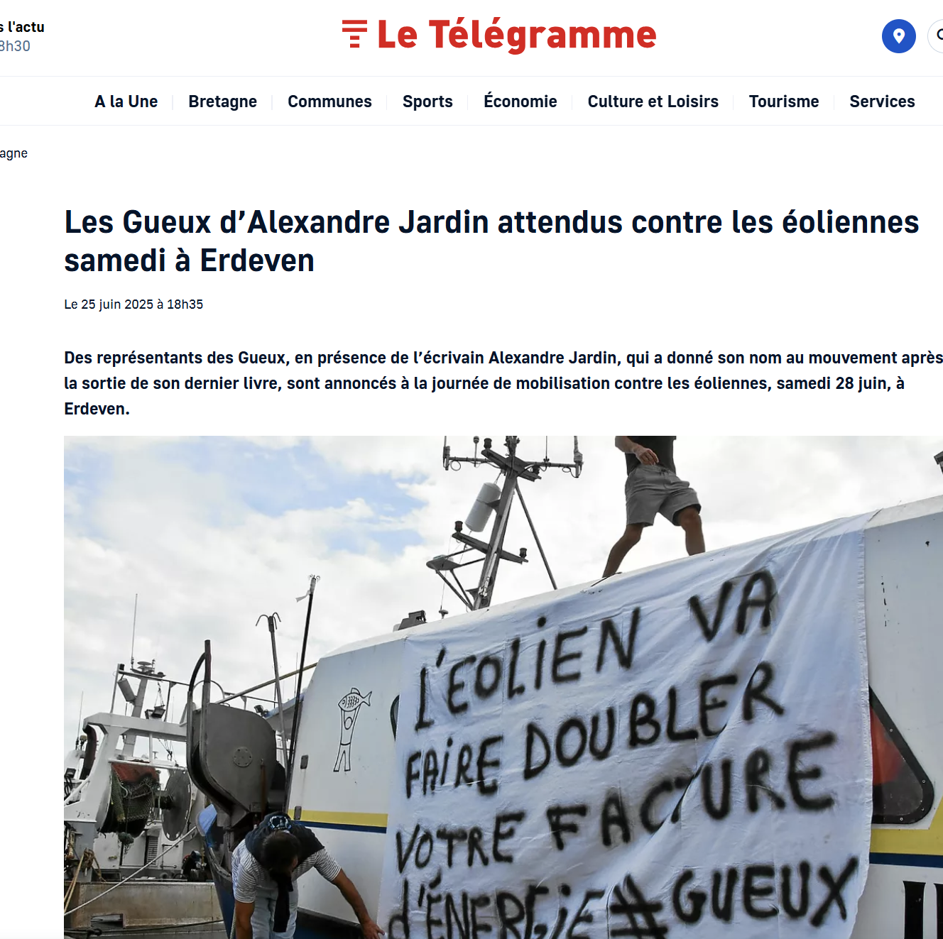 Avec l'Union Française des Artisans Pêcheurs (UFPA), le collectif des Pêcheurs Artisans, les maires mobilisés contre l'éolien (Vent des maires), les agriculteurs de la Coordination Rurale, la Fédération Environnement Durable, les associations locales contre l'éolien en mer (PIEBIEM, les gardiens du large), les #Gueux, menés par Alexandre Jardin, lancent une grande mobilisation nationale contre le Programme Pluriannuel de l'Energie prévoyant un plan éolien et solaire de 300 milliards aux frais des Français. Paris, France – Un large collectif de pêcheurs, d'agriculteurs, de maires et de défenseurs de l'environnement s'unit au mouvement des #Gueux, conduit par l'écrivain Alexandre Jardin, pour une grande mobilisation nationale le samedi 28 juin 2025