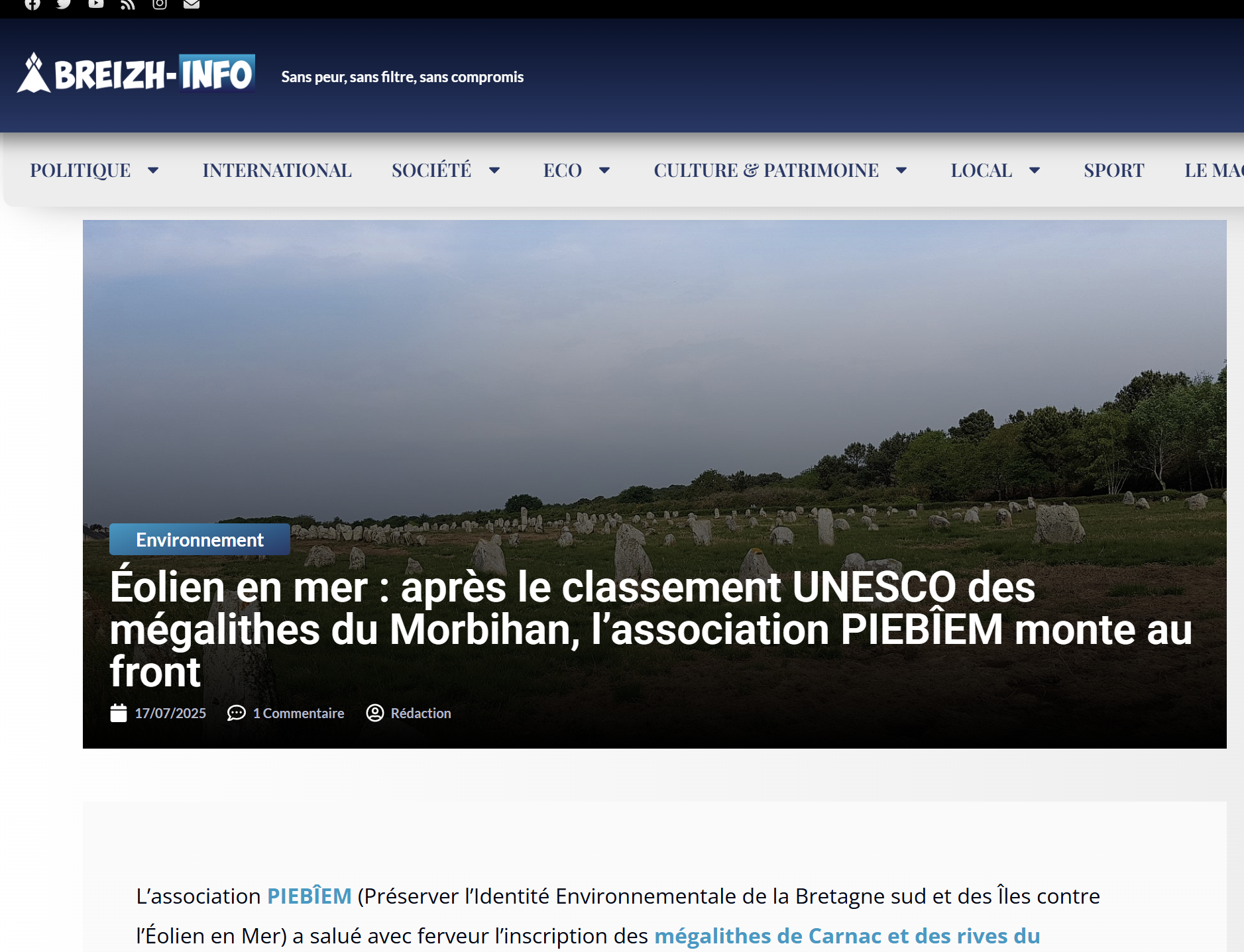 CP-PIEBÎEM -15 juillet 2025 : Mégalithes de Carnac et des rives du Morbihan : l'esprit et la lettre du classement UNESCO doivent être respectés par le projet industriel éolien en mer Bretagne Sud.