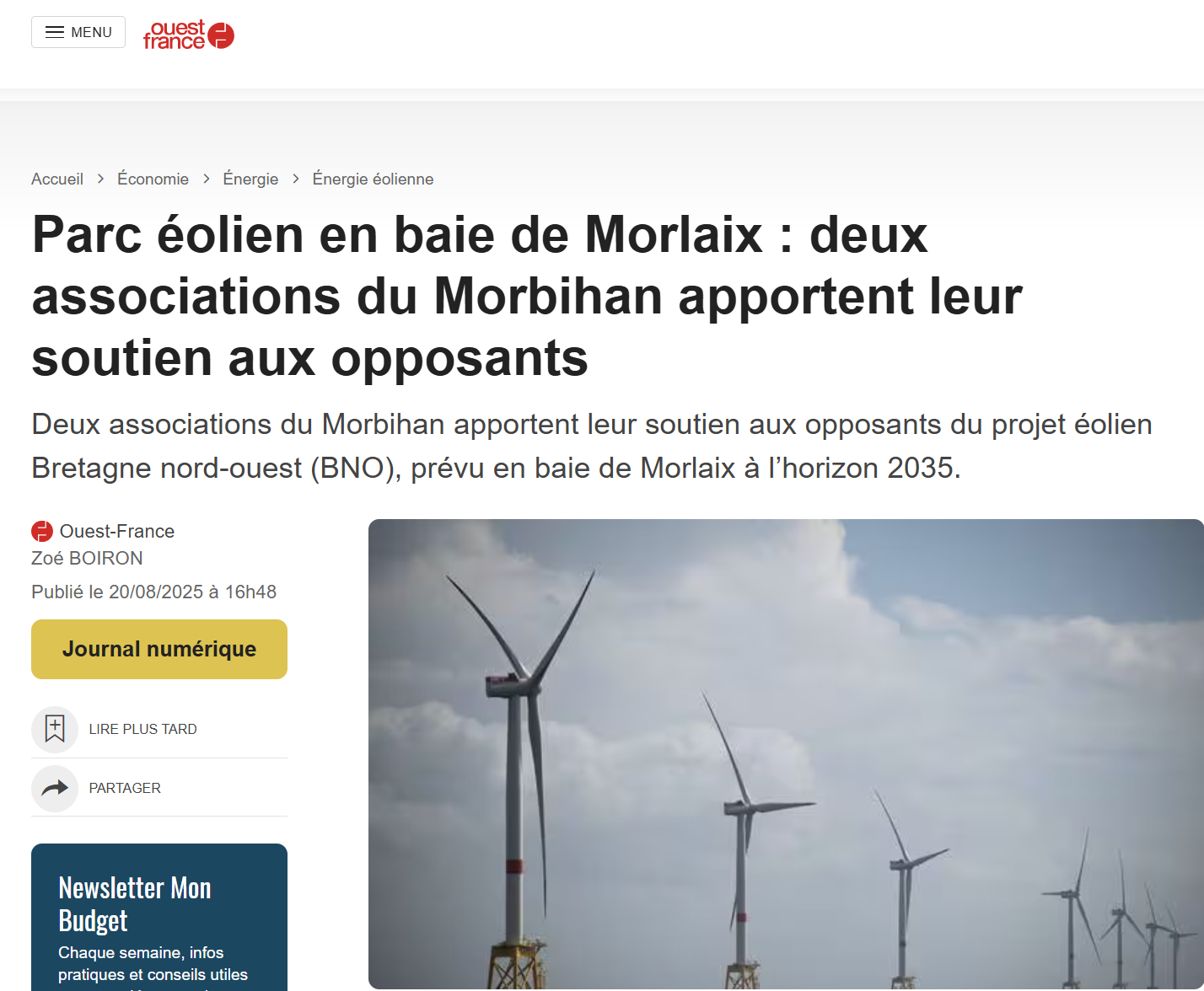Pour ces associations et ce collectif, il est en effet urgent que puissent être largement débattus les véritables enjeux et conséquences de la zone industrielle de Bretagne Sud, et au-delà, d'un programme éolien en mer insensé qui verrait les côtes bretonnes « accueillir » 25 GW d'éolien maritime, soit une trentaine de parcs de l'ampleur de Bretagne Sud