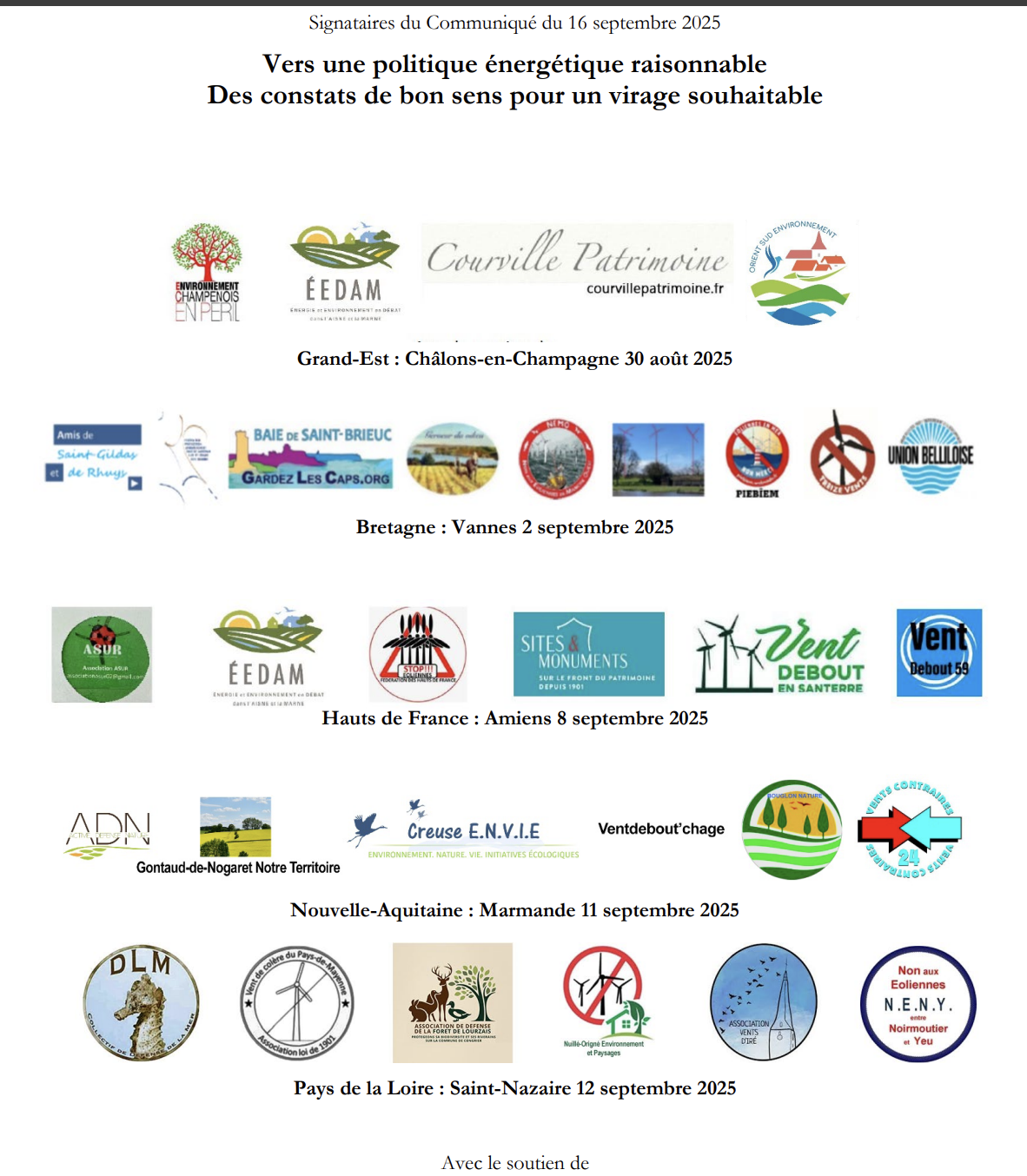 Les organisations : Amis de Saint-Gildas du Rhuys, Collectif Défense de la mer, Environnement Champenois en péril, EEDAM, Libre Horizon, NENY, Pulse, Sites & Monuments, Synadepa, Vent debout 69, Yeu vent debout