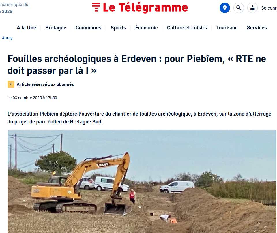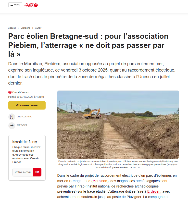 CP PIEBÎEM-3 octobre 2025 : Erdeven-périmètre UNESCO : des fouilles prétexte pour accélérer le projet de zone éolienne Bretagne sud ?