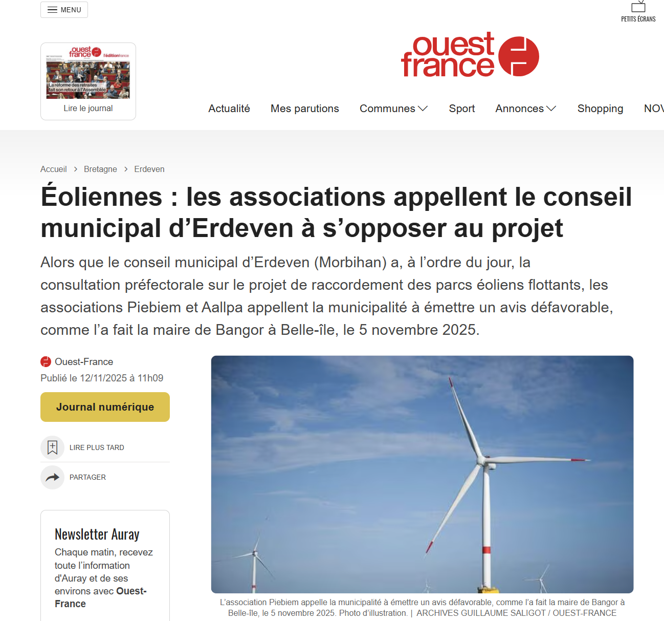 La mobilisation contre l'éolien en mer et le projet Bretagne sud monte. Cette année a été marquée par une montée en puissance de notre audience sur nos réseaux sociaux et dans la presse – et une présence accrue sur le terrain par l'organisation de manifestations ou participations à des événements. Vannes (19 octobre 24) a été ainsi la première manifestation, organisée par PIEBÎEM dans le Morbihan rassemblant luttes contre l'éolien marin et terrestre ; à Erdeven, le 28 juin 2025, organisée par PIEBÏEM et AALLPA, plus de vingt associations ont participé à une véritable convergence des luttes sur la plupart des thèmes importants : prix de l'électricité (Alexandre Jardin et les Gueux), la pêche artisanale (UFPA…), protection des paysages et du patrimoine ( Eugène Riguidel, Soulèvement des pierres, Koun Breizh), protection de la biodiversité (Sea Shepherd). Nous avons également été présents aux réunions non d'information mais de propagande organisées par Pennavel à Lorient, Sauzon, Bangor, avec toujours le même constat : Pennavel refuse tout débat, toute possibilité d'échange d'arguments- à Erdeven, ils ont préféré annuler la réunion prévue., et récemment à Belle-Île ont refusé l'invitation à débattre avec nous du groupe Vivre à Belle-Ile-en-Mer... Texte complet ci-joint