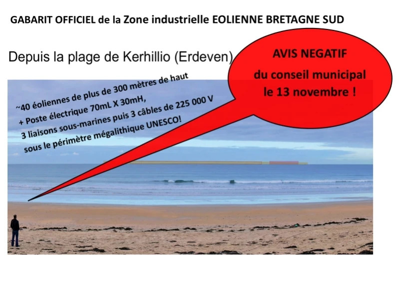 Aujourd'hui, si le projet de zone éolienne Bretagne Sud se fait, toutes les communes du Grand Site (Gâvres, Plouhinec, Étel, Erdeven, Plouharnel, Saint-Pierre-Quiberon et Quiberon) auront pleine vue en permanence sur une quarantaine d'éolienne de plus de trois cent mètres de haut. L'étude officielle paysagère et patrimoniale de la DGEC est particulièrement révélatrice du saccage qui pourrait advenir ... texte complet ci-joint