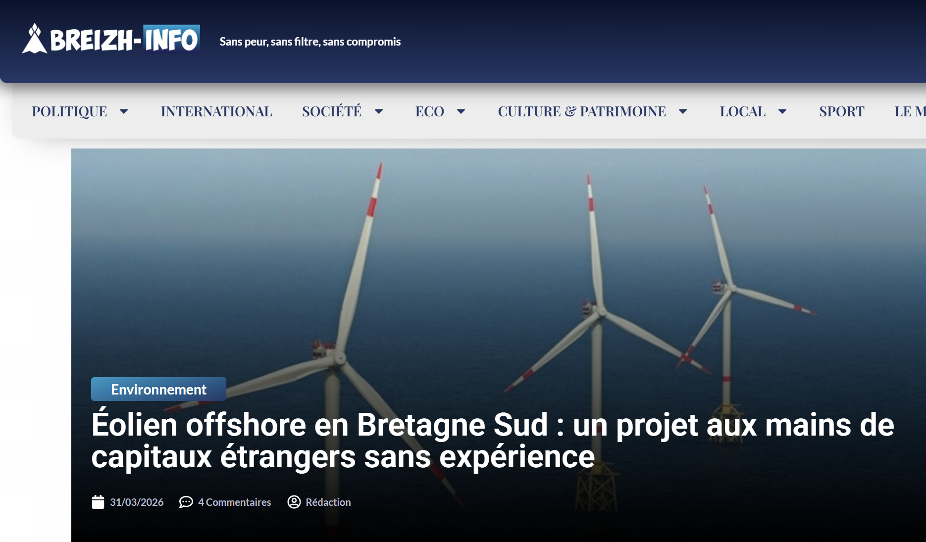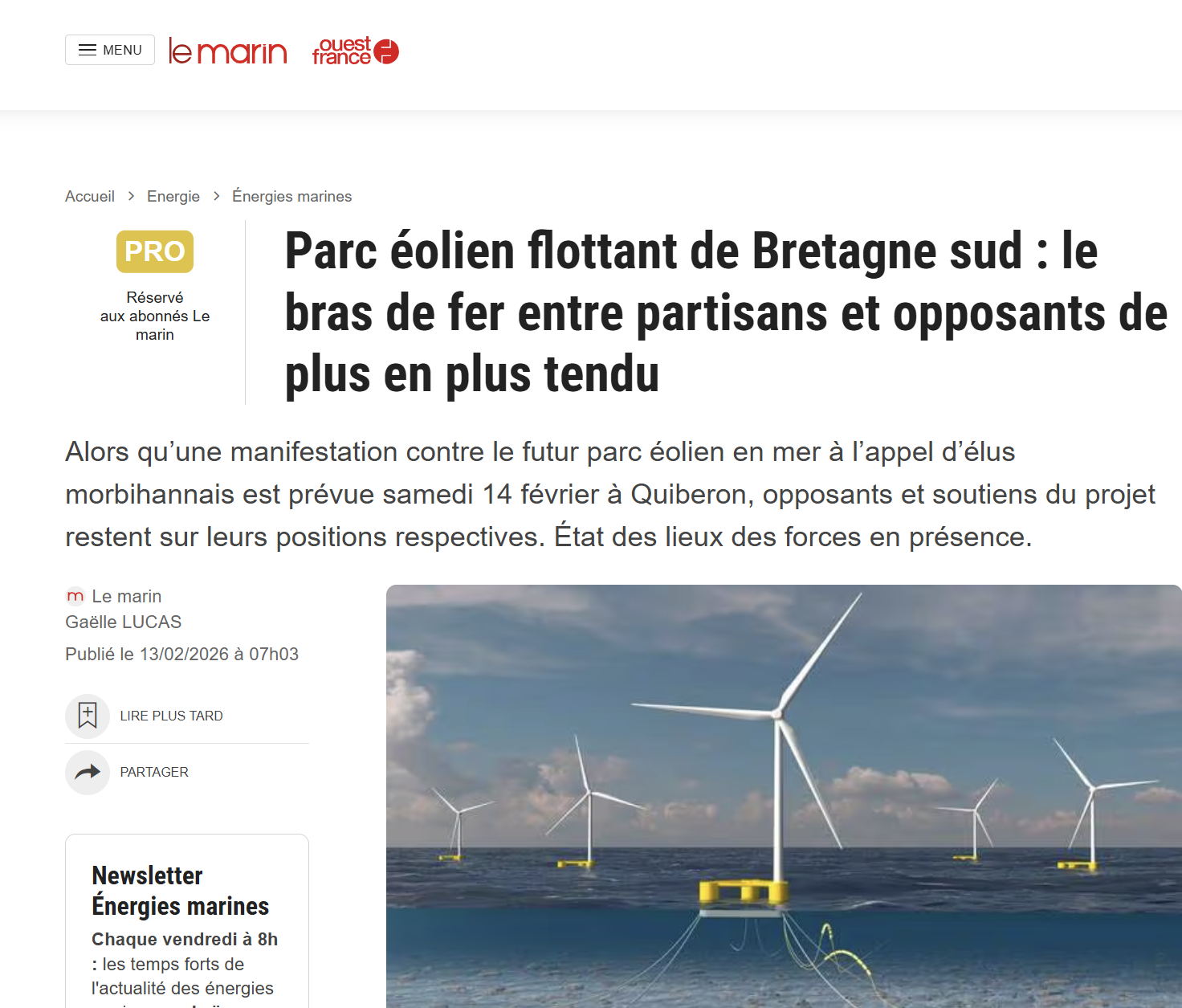 Depuis plusieurs années, Les associations membres de la Fédération Environnement durable - Les Gardiens du Large ( en partenariat notamment avec l'Union Française des Pêcheurs Artisans , la Fédération de défense de développement de la baie de Quiberon, Sites et monuments...) et l'association Préserver l'Identité Environnementale de Bretagne Sud et des Iles contre l'Eolien en Mer (P.I.E.B.Î.E.M) - mènent un travail rigoureux scientifique, économique et documenté sur les projets d'éolien en mer en Bretagne Sud. Leurs analyses techniques ont permis aux maires du littoral du Morbihan de disposer, dans des délais contraints, d'éléments clairs et opérationnels face à des dossiers administratifs complexes, renforçant la crédibilité de leur mobilisation. Ce travail de converge aujourd'hui avec les constats officiels de RTE , qui reconnaît dans son Bilan prévisionnel 2025-2035 une consommation d'électricité stagnante, une surproduction structurelle d'environ 20 %, et introduit un scénario de « décarbonation lente » réduisant fortement le recours à l'éolien en mer, en particulier flottant, désormais identifié comme coûteux et non prioritaire....