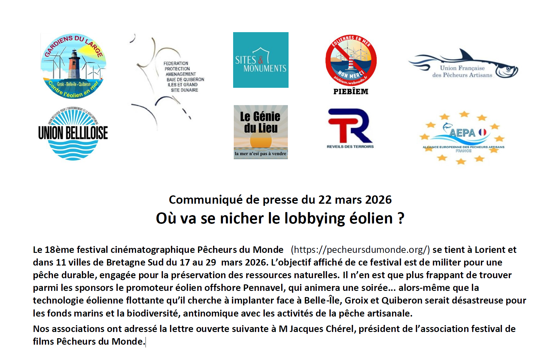Le 18ème festival cinématographique Pêcheurs du Monde (https://pecheursdumonde.org/) se tient à Lorient et dans 11 villes de Bretagne Sud du 17 au 29 mars 2026. L'objectif affiché de ce festival est de militer pour une pêche durable, engagée pour la préservation des ressources naturelles. Il n'en est que plus frappant de trouver parmi les sponsors le promoteur éolien offshore Pennavel, qui animera une soirée... alors-même que la technologie éolienne flottante qu'il cherche à implanter face à Belle-Île, Groix et Quiberon serait désastreuse pour les fonds marins et la biodiversité et antinomique avec les activités de la pêche artisanale.