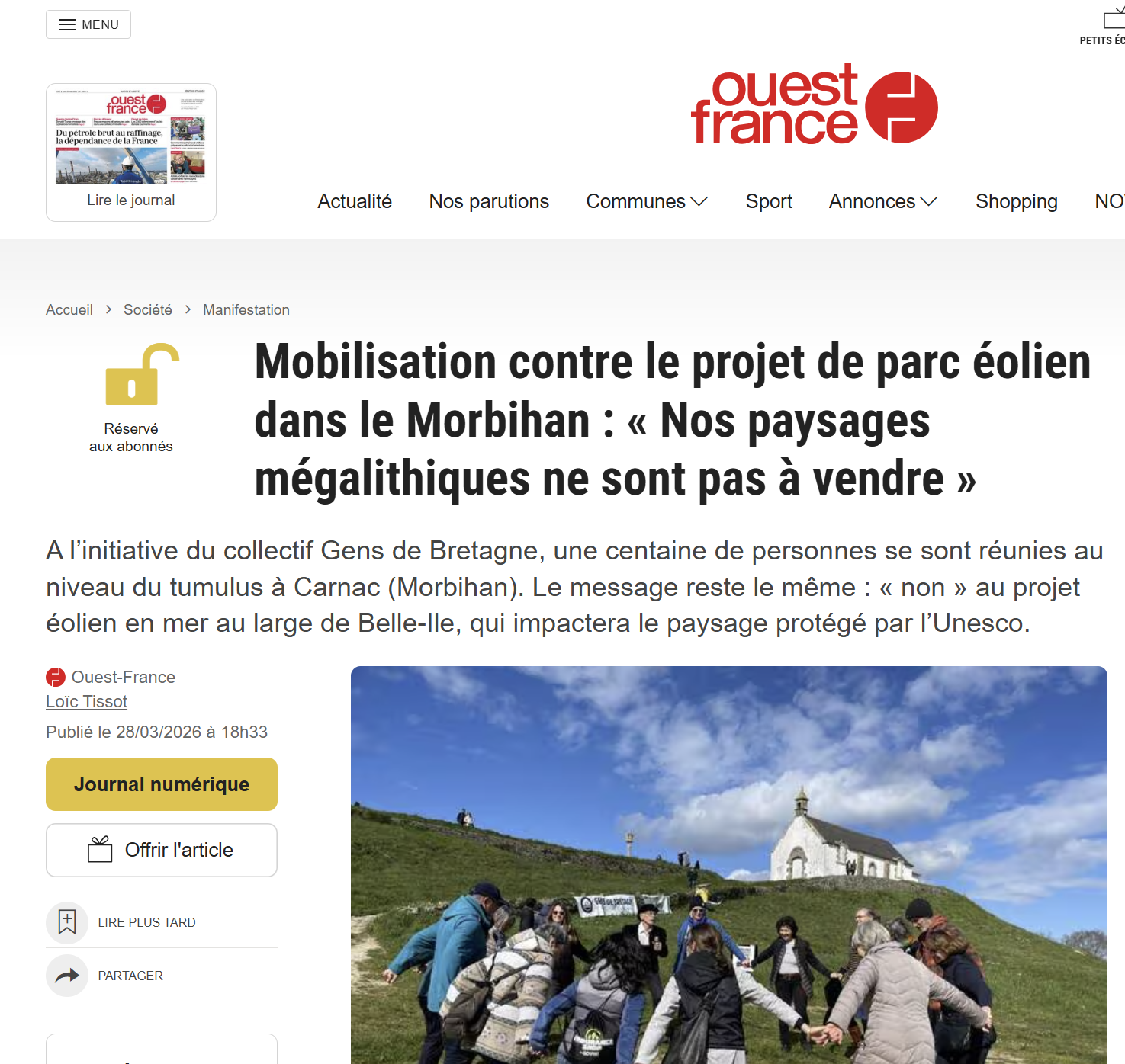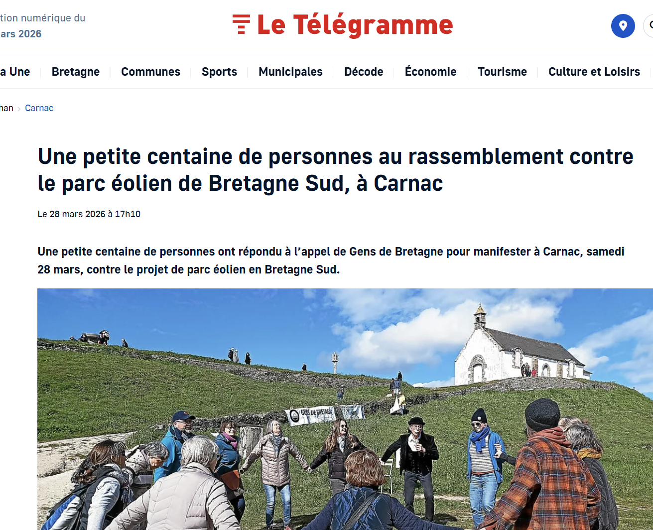 Alors évidemment, PIEBÎEM était présent à Carnac le 28 mars 26 pour manifester et faire connaitre son opposition à cette absurdité : obtenir un classement Unesco des mégalithes de Carnac et des rives du Morbihan (bien mérité) et coller face à des endroits emblématiques comme le tumulus Saint-Michel à Carnac et Petit-Mont à Arzon une zone industrielle de 40 éoliennes de plus de 300 mètres de haut qui en bouchera l'horizon et qui sera également visible de dizaines de sites mégalithiques comme ceux de la presqu'ile de Quiberon ou même de Gavrinis, la cathédrale du mégalithique. Ou cette autre absurdité qui consiste à faire passer trois câbles de 225000 volts à travers une partie non encore fouillée du champ mégalithique d'Erdeven , également classée Unesco - video