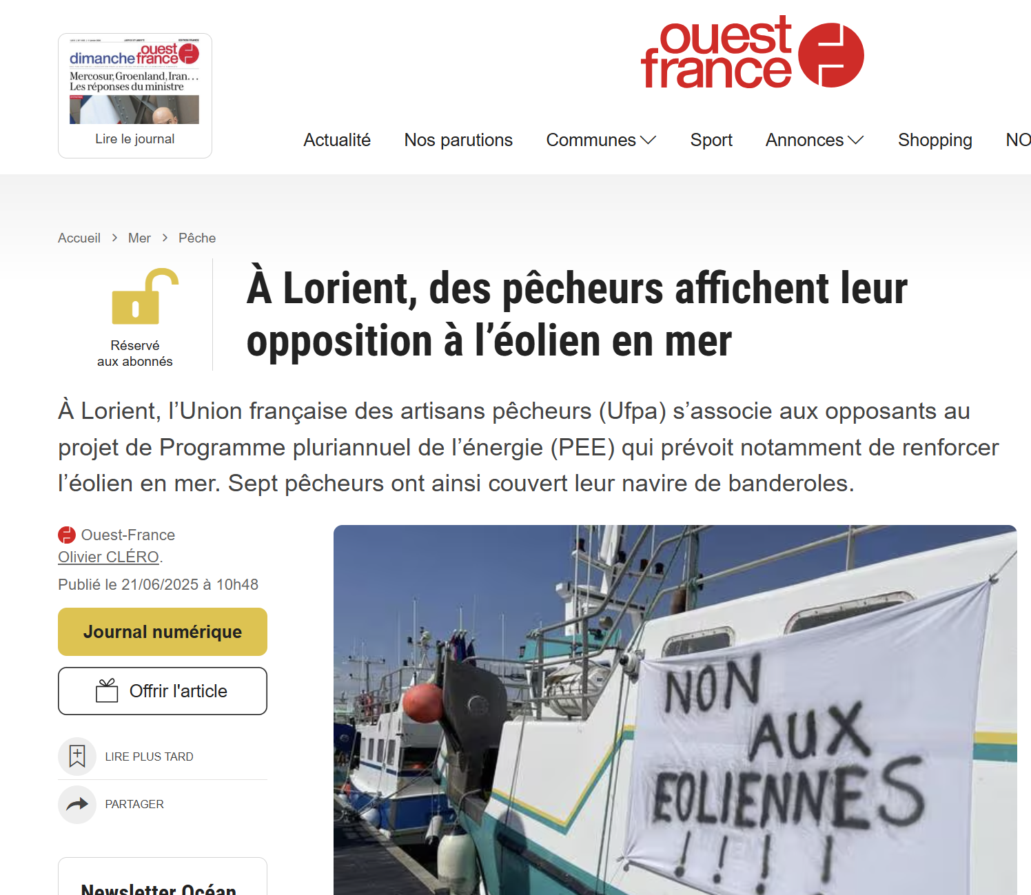 Rappelons que ce programme insensé de 45 GW d'éolien en mer est d'intérêt climatique nul dans le contexte français, dangereux pour la sécurité d'alimentation électrique, économiquement et socialement insoutenable, avec des promesses fallacieuses d'emploi et de fortes dépendances étrangères, met en péril des activités comme la pêche côtière artisanale et le nautisme et annihile plus de cent ans d'effort de protection du littoral, de ses paysages et de sa vie marine !