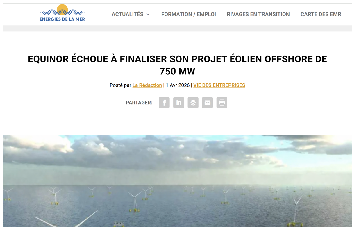 Alors que le gouvernement persiste dans sa folie d'un programme éolien en mer insensé, inutile et dévastateur ( lancement d'un appel d'offre pour 10 projets de fermes éoliennes en mer d'ici 2027), 18 GW en 2037 et 45 GW en 2050, lien lien . PIEBÎEM fait le point sur les dernières actualités de l'éolien en mer à l'étranger 1...