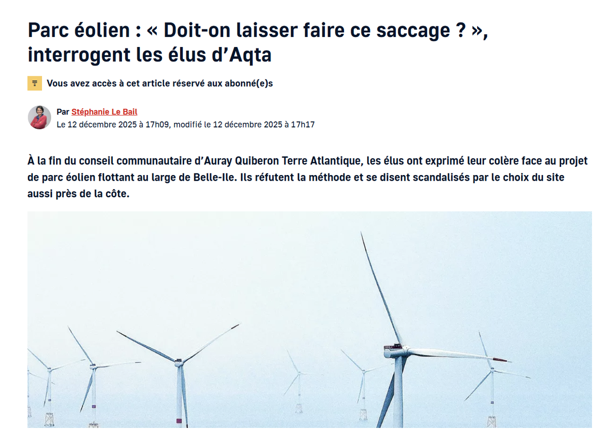 Le 4 décembre 2025 a eu lieu à Vannes la première séance de la très mal nommée Instance de Concertation et de Suivi (ICS) du projet de parc éolien flottant Bretagne-Sud dans un climat d'emblée délétère. Les opposants au projets, dont PIEBÎEM ont été exclus de l'ICS et des groupes de travail, c'est plus commode pour propager tranquillement...