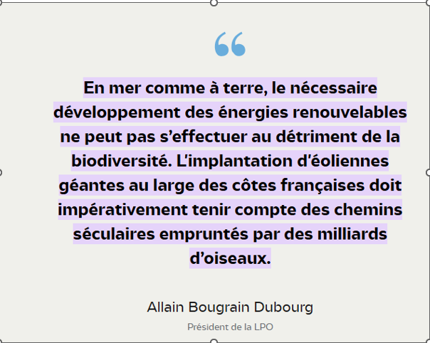 A la suite de la publication de l'étude Migralion (lien ) qui montre en Méditerranée un flot migratoire d'oiseaux plus massif qu'attendu, des zones éoliennes en mer très mal positionnées sur les zones de migration ou d'occupation préférentielles des oiseaux et des éoliennes mal conçues meurtrières pour les petits comme pour les grands oiseaux, la...