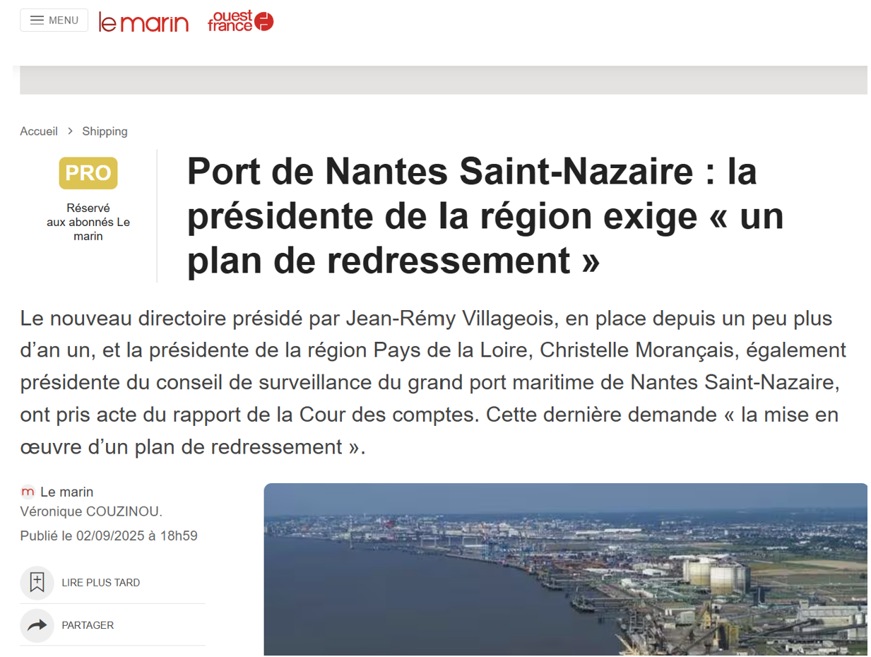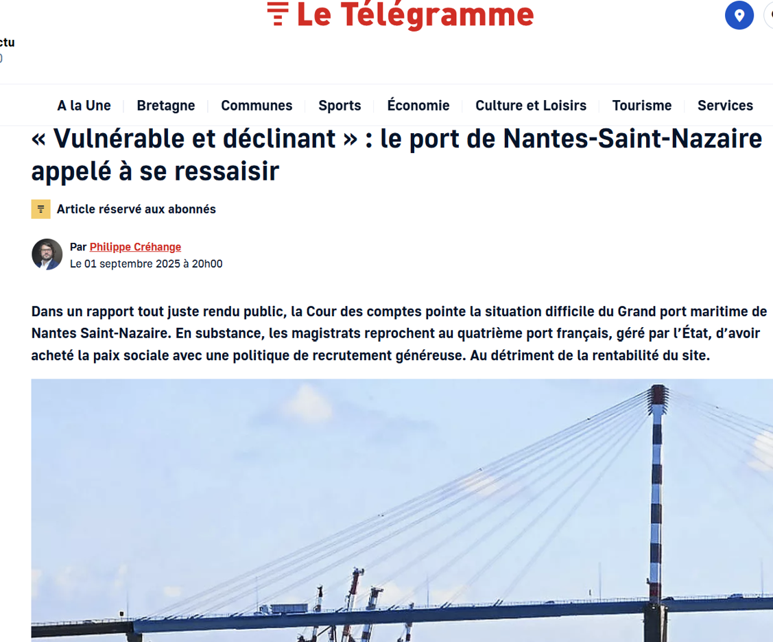 La Cour des Comptes vient de publier un rapport sur le Port de Saint-Nazaire et les projets d'aménagements liés à l'éolien flottant et c'est assez sanglant. PIEBÎEM, qui avait participé à la consultation publique et averti du fort risque de coûts échoués fait le point : 1) Un projet financé qu'à 35 millions € sur 235 et dont la rentabilité ne saurait reposer que sur les subventions publiques ; 2) Un tiers des financements totaux de l'Ademe pour le plan portuaire. Le plan de financement reste à boucler !; 3) Un projet risqué tributaire de la capacité des acteurs privés dans un contexte de plus en plus difficile ; 4) Les incertitudes techniques de l'éolien flottant et « la maturité limitée de la réflexion sur le modèle économique du quai» ; 5) Des doutes sur la stratégie pour l'éolien en mer dont le pari français parait particulièrement ambitieux ; 6) Des investissements représentant plusieurs années de chiffre d'affaire des ports, une forte concurrence et de forts risques de coûts échoués.