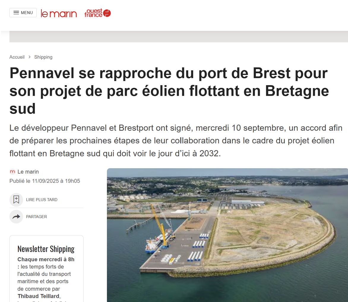 NB2) Pennavel se rapproche du port de Brest pour son projet de parc éolien flottant en Bretagne sud .Le développeur Pennavel et Brestport ont signé, mercredi 10 septembre, un accord afin de préparer les prochaines étapes de leur collaboration dans le cadre du projet éolien flottant en Bretagne sud qui doit voir le jour d'ici à 2032. Lien