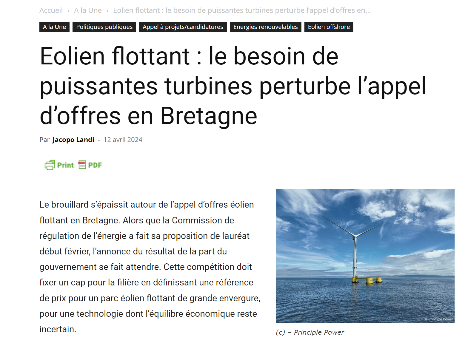 "Le brouillard s'épaissit autour de l'appel d'offres éolien flottant en Bretagne. Alors que la Commission de régulation de l'énergie a fait sa proposition de lauréat début février, l'annonce du résultat de la part du gouvernement se fait attendre. Cette compétition doit fixer un cap pour la filière en définissant une référence de prix pour un parc éolien flottant de grande envergure, pour une technologie dont l'équilibre économique reste incertain.... Mais l'histoire est loin d'être réglée. Plusieurs candidats ont déjà jeté l'éponge et des sources concordantes suggèrent des hésitations"