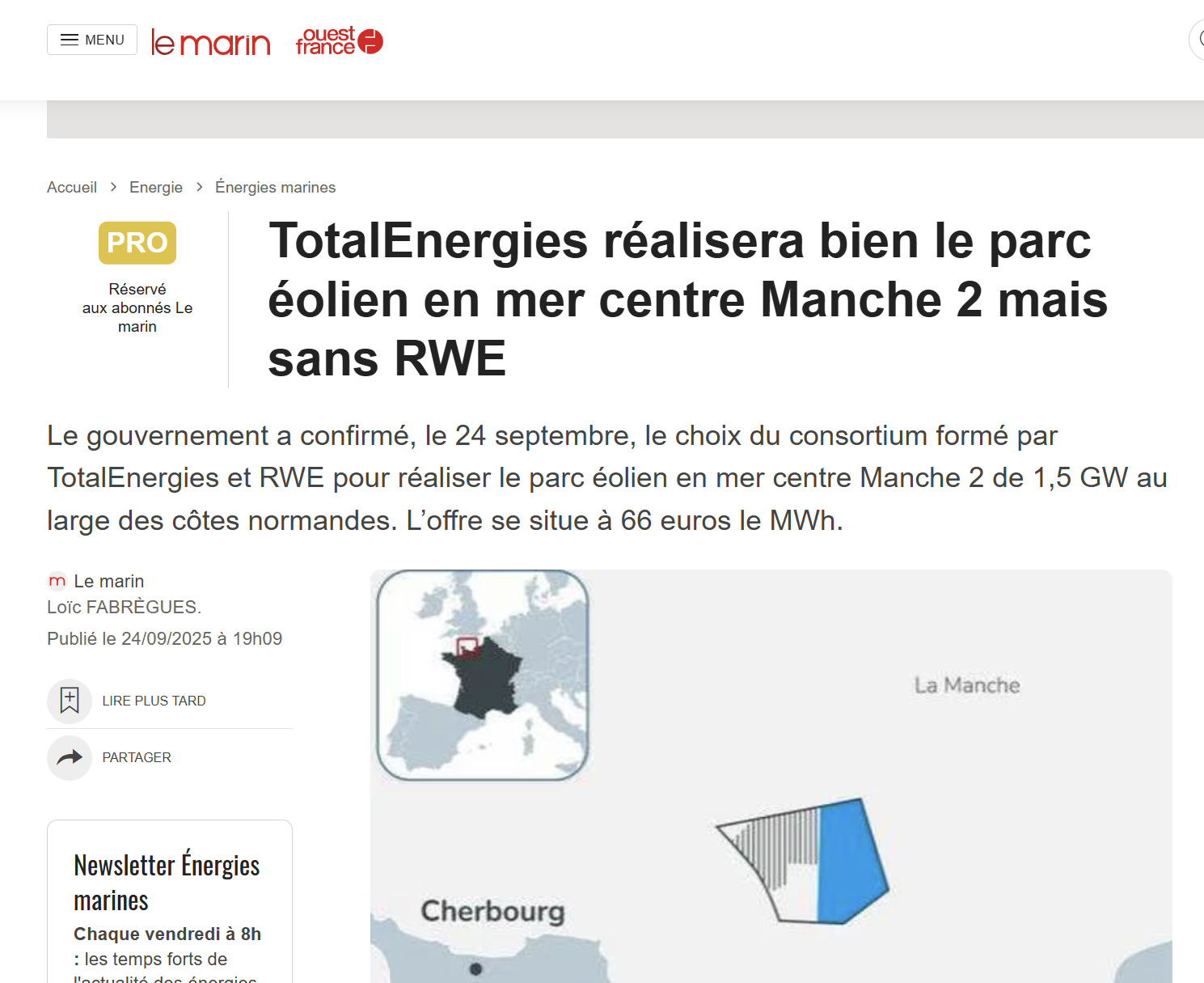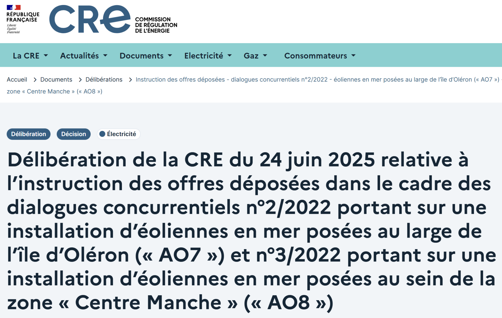 « Le candidat retenu par le Gouvernement est le groupement Cotentin Energies Marines, composé de TotalEnergies et RWE. L'offre de ce groupement avait été classée deuxième par la CRE, à égalité de points avec celle de l'autre candidat. La CRE a pris acte du choix du Gouvernement. »