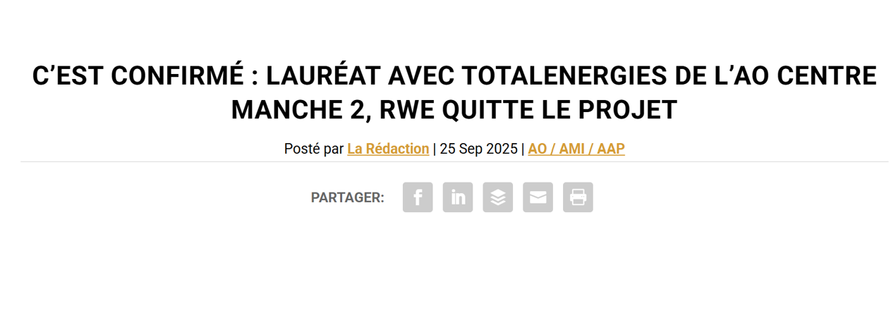 2b) Le consortium désigné explose avant même l'attribution :Le candidat annoncé par le ministre était le consortium Total/Energie/RWE. Moins d'un mois auparavant , RWE avait fait savoir qu'il se retirait de l'éolien en mer en France lien . De fait, juste après l'attribution, RWE a fait savoir qu'il abandonnait le projet, laissant Total Energies seul – qui recherchera éventuellement un autre partenaire