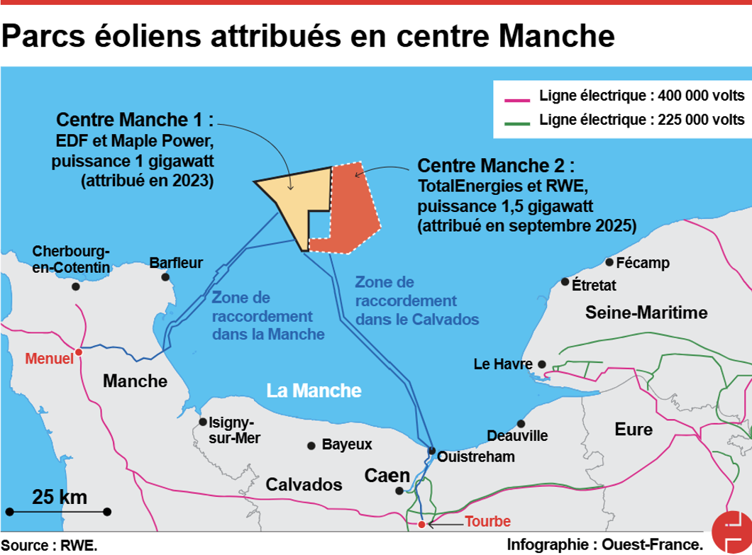 Centre-Manche-2 a donc été effectivement attribué à un consortium Total/Energie/RWE comme l'annonçait Les Echos le 16 septembre. Il s'agit d'un projet de 1,5 GW situé à 40 km de la côte du Calvados, face à Ouistreham et Omaha Beach. Il jouxte le parc Centre Manche 1, d'une capacité de 1 gigawatt, attribué en 2023 à EDF et son partenaire canadien Maple Power. L'investissement prévu est de 4,5 milliards d'euros (sans le raccordement, puisqu'en France, c'est RTE et non l'exploitant qui le prend en charge. Le prix de vente proposé par TotalEnergies est de 66 € du mégawattheure.