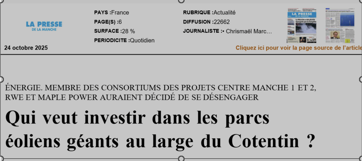Maple Power a informé EDF renouv. de sa volonté de se désengager du projet Centre Manche 1 : le consortium Eolienne en mer manche Normandie formé par EDF renouvelable devenu Power solution 60% et son allié traditionnel dans l'éolien offshore Maple Power 40% a remporté en mars 2023 l'AO4 portant sur l'installation d'un gigawatt d'éolienne dans la Manche… La mise en service de Centre Manche 1 est attendue pour fin 2032 au mieux mais avec un départ de Maple Tower qui ne financerait déjà plus le projet la rentabilité prévue n'est pas satisfaisante.