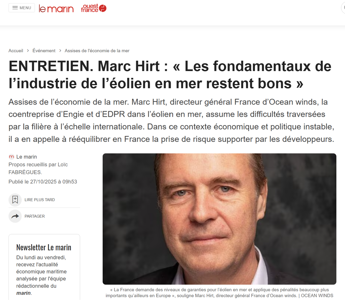 Une interview du PDG d'Ocean Wind publié par Le Marin (27octobre lien titre « Les fondamentaux de l'industrie de l'éolien en mer restent bons » . Sauf que l'intérieur de l'article est un peu différent : « Compte tenu des difficultés que les développeurs ont pu rencontrer dans de nombreux pays, le risque de ne pas aller au bout d'un projet est perçu comme plus élevé qu'avant. Or la France demande des niveaux de garanties et applique des pénalités beaucoup plus importants qu'ailleurs en Europe. Cela fait réfléchir à deux fois avant de remettre une offre.