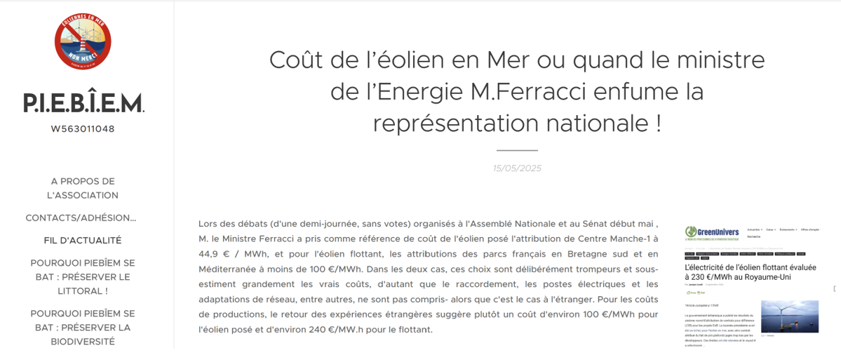 PIEBÎEM : la forfaiture de M. Ferracci : rappelons que Centre- Manche 1 avait fait l'objet de forte critiques lors de son attribution en raison d'un prix bas proposé par EDF : « La CRE s'est exprimé sur le sujet avec une prudence extrême : « Les prix bas sont une bonne nouvelle pour les finances publiques, sous réserve que cela soit soutenable pour les porteurs de projets… Pouyanné PDG de Total Energie s'adressant ainsi à, à M. Luc Rémont (PDG d'EDF) : « « Si tu fais un investissement, tu prends sans doute pas 50 euros le MWh comme hypothèse, mais sans doute beaucoup plus. On n'investit pas dans l'éolien offshore en Europe à 50 euros le MWh, ce n'est pas vrai !... Avec des prix aussi bas, dans le meilleur des cas, si le projet est faisable, c'est en étranglant la supply chain qui rencontre déjà d'énormes difficultés »