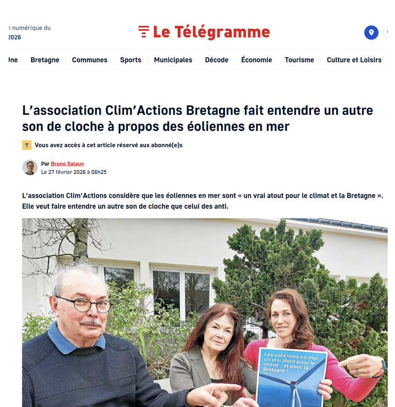 Dans un article très bien mis en valeur par le Télégramme, lien, l'association Clim'Actions Bretagne prétend faire entendre un autre son de cloche à propos des éoliennes en mer et proclame : « pas question d'abandonner le terrain aux opposants à l'éolien en mer, au large des côtes bretonnes. D'autant « qu'ils émettent des arguments qui sont loin d'être toujours exacts et qui ne contribuent pas forcément à rendre les enjeux lisibles et clairs pour le public ».