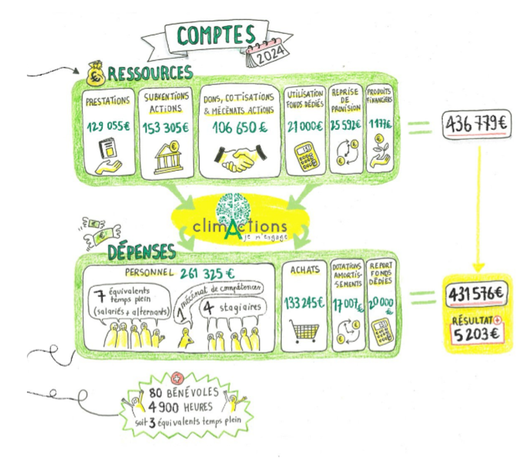 Clim'Actions Bretagne se présente comme un « laboratoire citoyen d'idées et de projets » créé en 2015. Il employait en 2024 sept équivalents temps plein, un mécénat de compétence (payé par un industriel ou une administration) et un stagiaire pour une masse salariale totale de 261 325 €. II bénéficiait de 153 305 € de subventions (argent public), était rémunéré 129 055 € pour ses prestations (argent public majoritairement ?) et recevait 106 650 € de dons, mécénats et cotisations (ventilés comment, de qui ?).