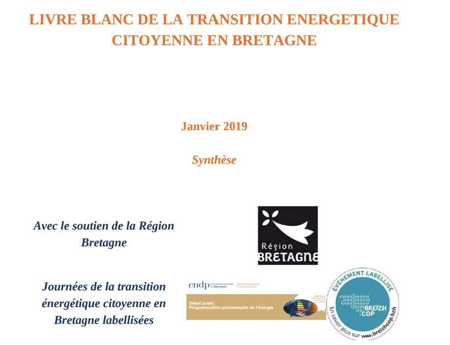 Sur son site, Clim'Actions Bretagne revendique comme ressource un livre blanc constituant « une solide base de travail au service de la transition énergétique en Bretagne. » lien et dont il est mentionné que ce « livre blanc se situe dans le cadre du scénario négaWatt » avec pour but de « privilégier les énergies renouvelables pour leur faible impact sur l'environnement et leur caractère inépuisable (100% de nos besoins en 2050) » ( NB c'est comme si c'était fait, sauf qu'il a été démontré que c'était impossible.) Le livre blanc réclame une règlementation nationale imposant les énergies renouvelables, avec une fiscalité adaptée et reprends tous les poncifs du genre, par exemple :