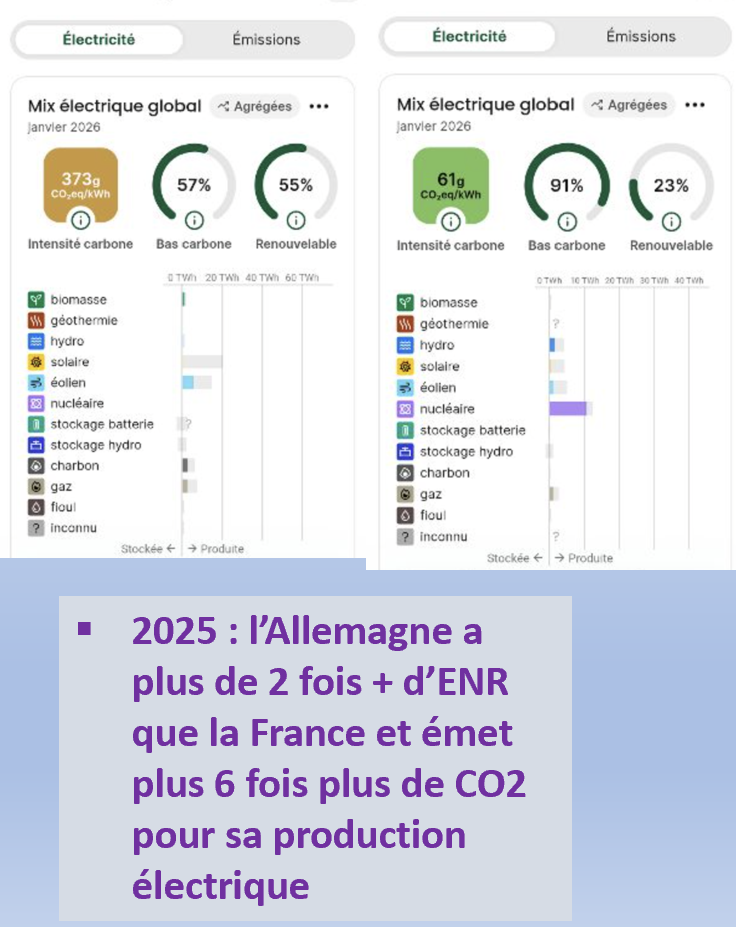 Sauf que justement l'Allemagne est un échec complet ; l'une des électricités les plus chères d'Europe, plus de deux fois plus d'ENR que la France (55% contre 23%) et pourtant elle émet plus 6 fois plus de CO2 pour sa production électrique (370 gCO2/kWh contre 61g/CO2/kWh en 2025) et l'Allemagne n'arrive toujours pas à se passer de son charbon. Le second modèle présenté est le Danemark, « territoire assez comparable à la Bretagne, qui a une avance énorme en matière d'EnR et d'indépendance énergétique ». En fait, il a surtout l'électricité la plus chère d'Europe, est complètement dépendant de l'immense réservoir d'électricité hydraulique de ses voisins nordiques, et relance son gaz et va se lancer dans le nucléaire lien lien .