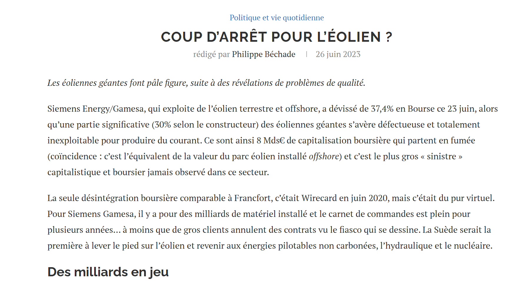 "Siemens Energy/Gamesa, qui exploite de l'éolien terrestre et offshore, a dévissé de 37,4% en Bourse ce 23 juin, alors qu'une partie significative (30% selon le constructeur) des éoliennes géantes s'avère défectueuse et totalement inexploitable pour produire du courant. Ce sont ainsi 8 Mds€ de capitalisation boursière qui partent en fumée (coïncidence : c'est l'équivalent de la valeur du parc éolien installé offshore) et c'est le plus gros « sinistre » capitalistique et boursier jamais observé dans ce secteur..."