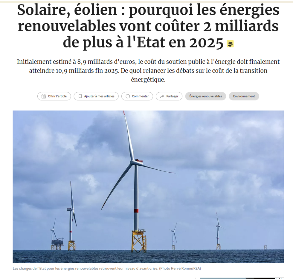 « En 2024, la CRE tablait sur un prix de gros moyen de 85 €/MWh. Mais les prévisions pour 2025 ont été revues à la baisse, à 65 €/MWh. Or les producteurs d'énergies renouvelables subventionnés bénéficient de contrats garantissant un tarif fixe : quand le marché est bas, l'État (et donc les consommateurs) leur verse la différence. Résultat : près de 1,9 milliard d'euros de charges supplémentaires rien que pour les filières renouvelables électriques. Avec un total de 11,6 milliards d'euros, dont près de 8 pour les seuls renouvelables, la CSPE devient une taxe énergétique masquée, pesant sur les factures des ménages comme sur celles des entreprises. »