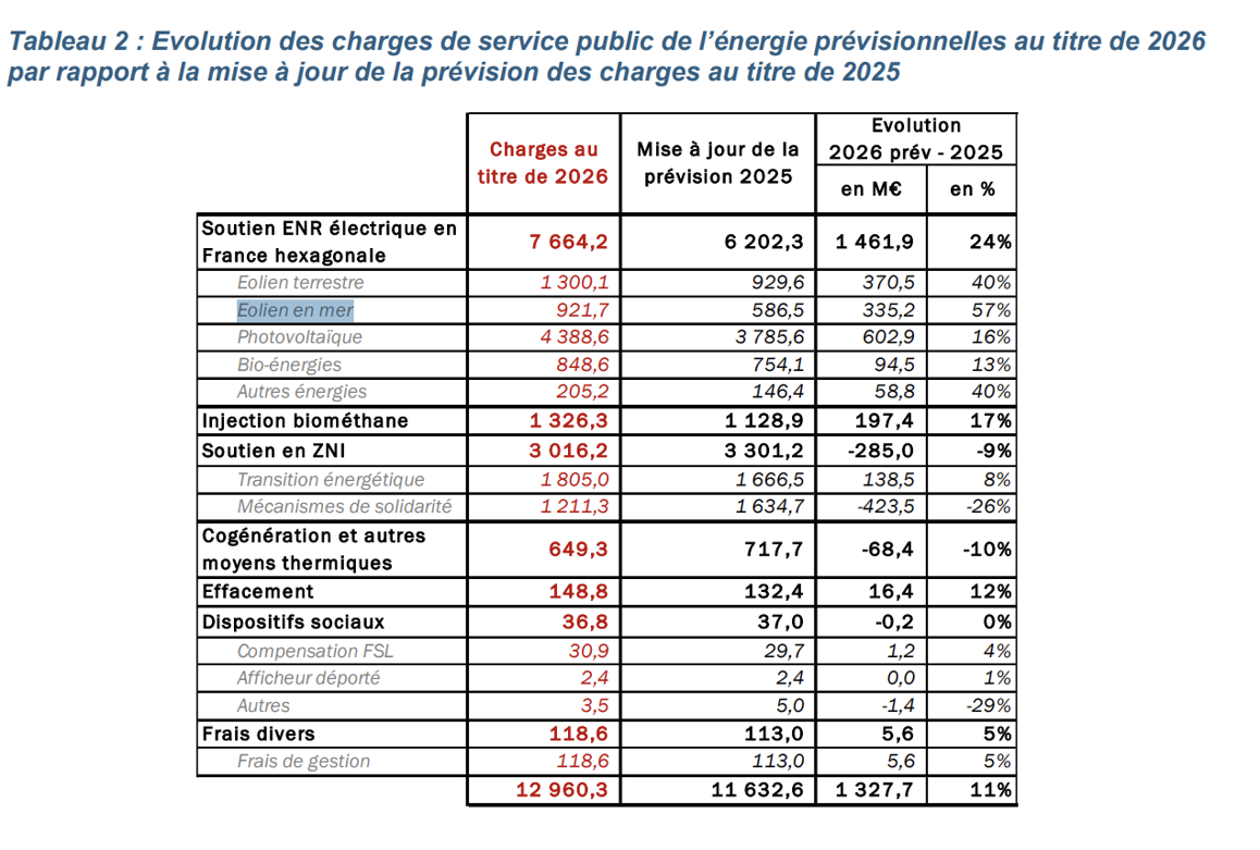 Pour 2026, le total prévu CSPE est de 12,9 Milliards d'euros (soit 16% d'augmentation) ; l'éolien terrestre augmente à 1,3 milliards ( soit 40% d'augmentation), l'éolien marin augmenta à 921 milliards ( soit 57% d'augmentation)…