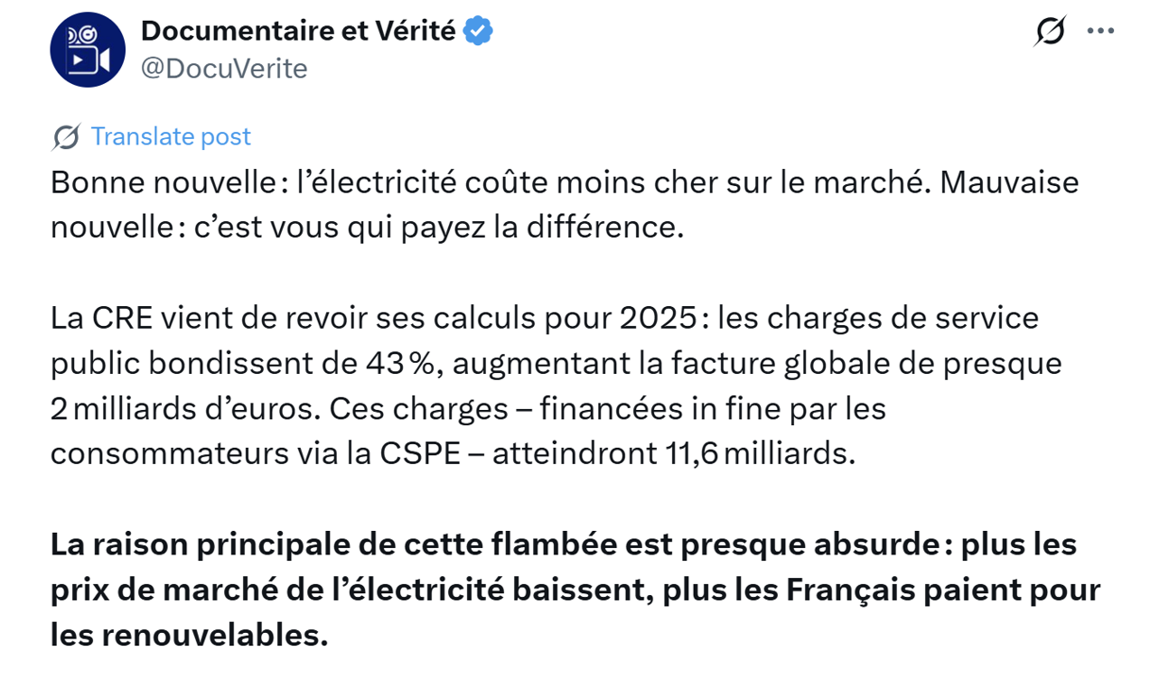 « Bonne nouvelle : l'électricité coûte moins cher sur le marché. Mauvaise nouvelle : c'est vous qui payez la différence. La CRE vient de revoir ses calculs pour 2025 : les charges de service public bondissent de 43 %, augmentant la facture globale de presque 2 milliards d'euros. Ces charges – financées in fine par les consommateurs via la CSPE – atteindront 11,6 milliards. La raison principale de cette flambée est presque absurde : plus les prix de marché de l'électricité baissent, plus les Français paient pour les renouvelables. »