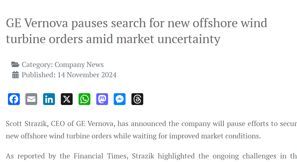 Il met en cause un marché devenu difficile pour l'industrie éolienne offshore, qui a dû faire face à des tensions sur la chaîne d'approvisionnement et à la hausse des taux d'intérêt. Il explique que les bénéfices des fabricants d'éoliennes se sont réduits alors que les entreprises entament une course au développement de modèles plus puissants, sous la pression des développeurs de parcs éoliens offshore – ce qui fait grimper fait grimper les coûts. Il rappelle que le gouvernement allemand a dû aider Siemens Energy en novembre dernier avec des garanties d'État sur une ligne de crédit bancaire de 11 milliards d'euros, alors que les pertes de son unité éolienne Siemens Gamesa se sont creusées en raison des coûts élevés et des difficultés de mise à l'échelle. GE Vernova et d'autres ont essayé de standardiser leurs turbines pour améliorer la qualité et réduire les coûts, mais en septembre, ils ont annoncé leur intention de réduire l'unité éolienne offshore avec des suppressions potentielles d'environ 900 emplois. En ce qui concerne la branche éolienne de GEVernova , il a annoncé des pertes de 317 millions de dollars au troisième trimestre sur l'EBITDA , affirmant que les marges plus élevées de l'éolien terrestre étaient « plus que compensées par des pertes supplémentaires d'éolien offshore ».