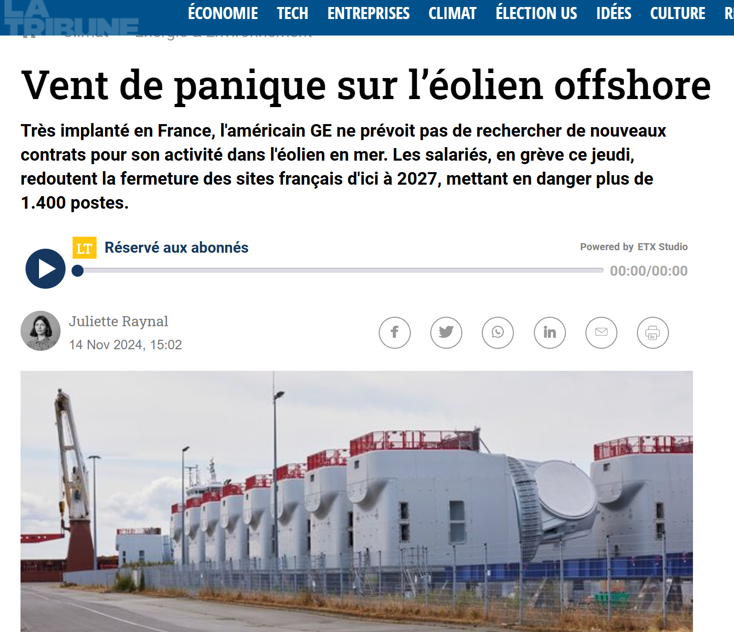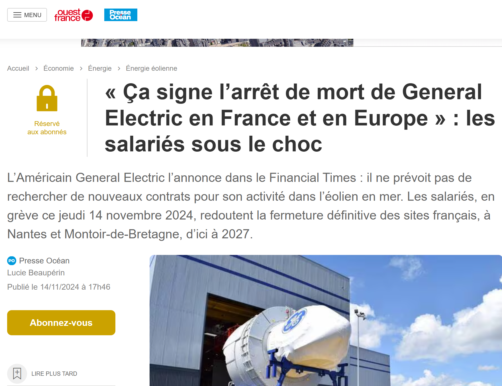 GE va donc uniquement se consacrer à ses zones industrielles éoliennes en cours, dont Dogger Bank. Cela représente un volume d'activité pour deux ans . Si pendant deux ans, GE-Vernova ne recherche pas d'autres contrats, c'est signer à court terme la fermeture du groupe. Les salariés français des usines de Montoir de Bretagne et de Nantes l'ont bien compris : « En l'état, le carnet de commandes du groupe dans l'éolien offshore, d'un montant de 3 milliards de dollars, ne permet de maintenir l'activité des deux sites que deux ans tout au plus… Nous savions qu'après 2027, il y avait un trou, mais nous ne savions pas à quel point ce canyon serait grand. Nous attendions de voir l'autre rive, avec l'espoir de décrocher un nouveau projet au Japon. Désormais, nous savons que nous ne la verrons jamais » . lien La tribune lien Ouest-france