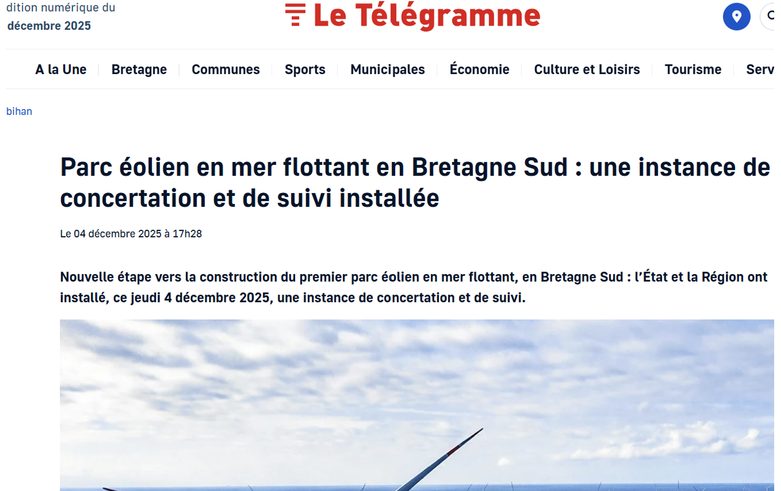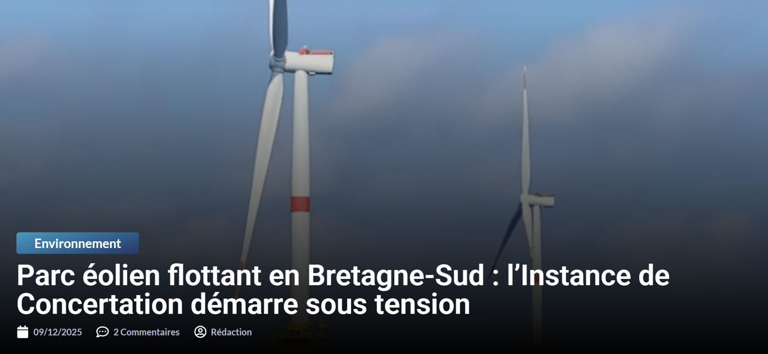 Le 4 décembre 2025 a eu lieu à Vannes la première séance de la très mal nommée Instance de Concertation et de Suivi (ICS) du projet de parc éolien flottant Bretagne-Sud Coprésidée par le préfet du Morbihan, Michael Galy, le préfet maritime de l'Atlantique, Jean-François Quérat et le vice-président de Région, Daniel Cueff, cette instance est censée avoir pour vocation « d'assurer un espace de dialogue entre les acteurs impliqués (l'État, Pennavel, le Réseau de transport de l'électricité (RTE), la Région, les usagers de la mer et permettre l'expression des territoires ; « assurer un espace de dialogue durable et contribuer à une gestion du parc et de son raccordement au plus près des préoccupations locales. ».