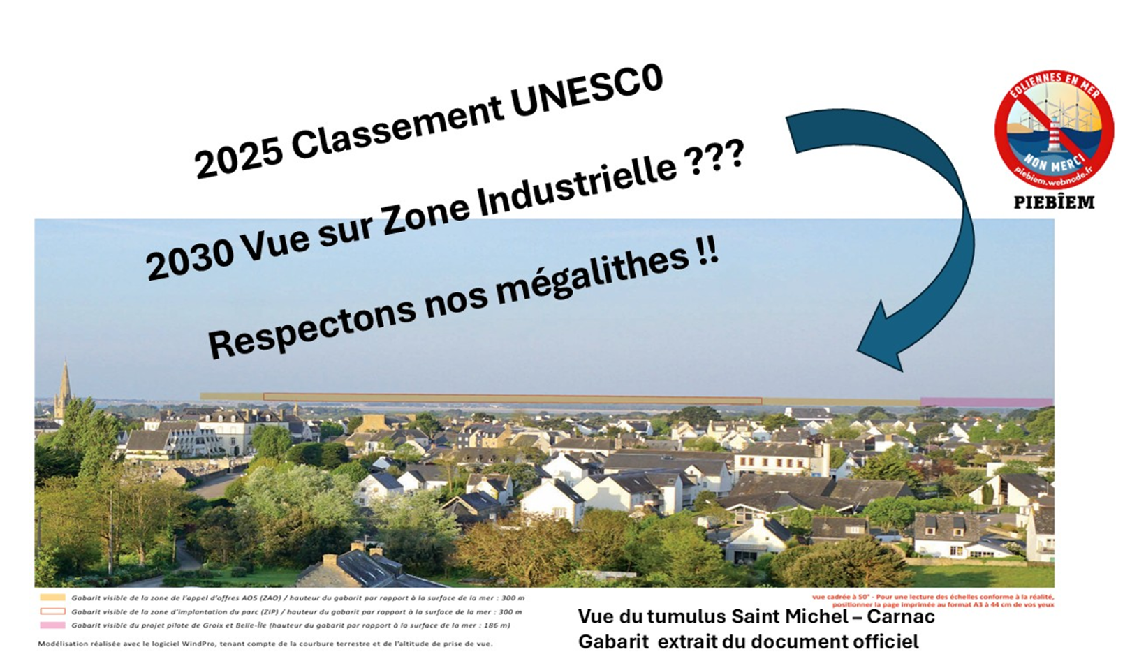 - On peut aussi dire que « l'instance a également permis de rappeler la compatibilité des projets de parcs éoliens en mer, et notamment de leur raccordement, avec l'inscription en juillet 2025 au patrimoine mondial de l'Unesco des mégalithes de Carnac et des rives du Morbihan… sans réaction officielle de l'Unesco, sans rappeler que l'Unesco a empêché la construction de trois éoliennes terrestres de 100 mètres à proximité du Mont Saint-Michel, sans rappeler la problématique de l'atterrage et du passage de trois câbles de 225000 volts à travers une partie non fouillée du périmètre Unesco d'Erdeven, et sans que l'on connaisse encore les résultats des fouilles préventives menées par l'INRAP lien lien