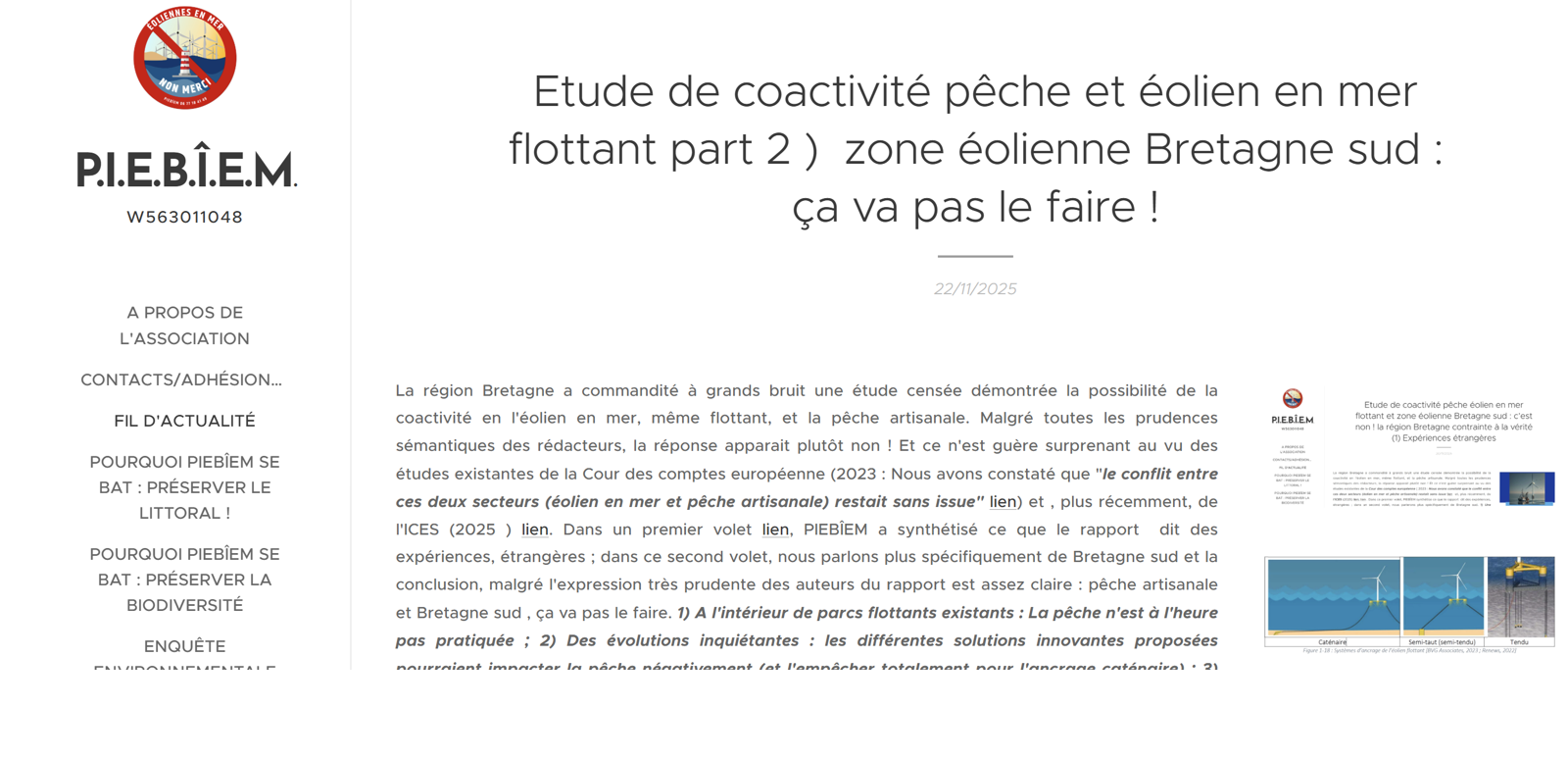 Le 4 décembre 2025 a eu lieu à Vannes la première séance de la très mal nommée Instance de Concertation et de Suivi (ICS) du projet de parc éolien flottant Bretagne-Sud dans un climat d'emblée délétère. Les opposants au projets, dont PIEBÎEM ont été exclus de l'ICS et des groupes de travail, c'est plus commode pour propager tranquillement propagande et mensonges et masquer les problèmes. 1) Instance de Suivi et de Concertation : réservée à ceux qui ne poseront pas trop de questions gênantes ; 2) La brutalité institutionnelle, le mensonge technique et le verrouillage administratif qui entourent l'AO5 relèvent d'une dérive autoritaire (FED) ; 3) Information ou propagande ? C'est plus facile en l'absence des associations et Pennavel et l'Etat mentent sans vergogne ; 4) « Votre opposition ne sert à rien ! »les élus et les citoyens méprisés : l'ICS, c'est du foutage de gueule !; 5) Pour PIEBÎEM, un comportement de l'Etat inacceptable qui annonce déjà qu'il accordera toutes les autorisations nécessaires, quelles qu'en soient les conséquences