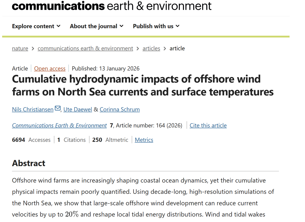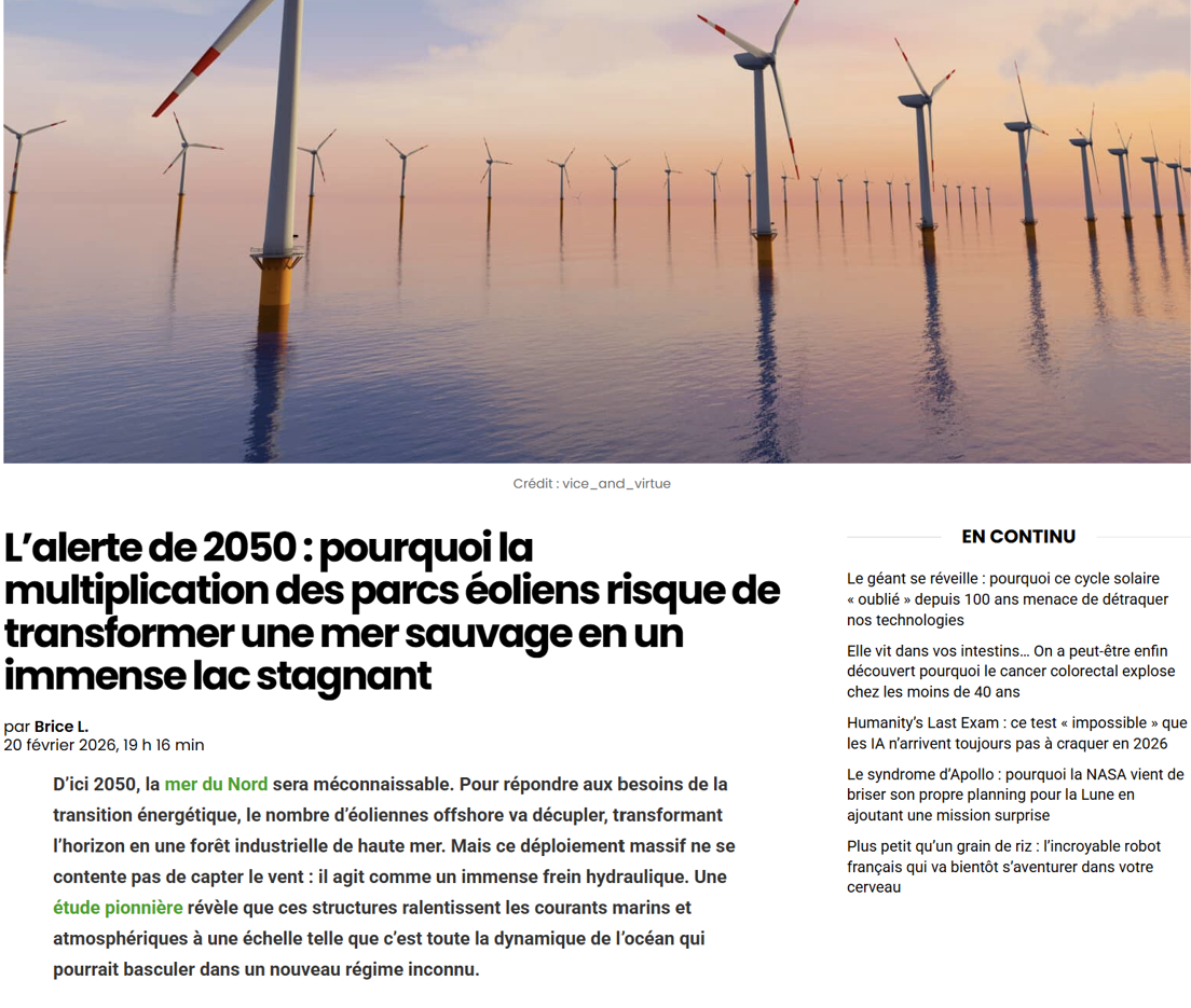 Les parcs éoliens offshore façonnent de plus en plus la dynamique océanique côtière, pourtant leurs impacts physiques cumulatifs restent mal quantifiés. En utilisant des simulations à haute résolution sur une décennie de la mer du Nord, nous montrons que le développement éolien offshore à grande échelle peut réduire les vitesses de courant jusqu'à 20 % et remodeler la distribution locale de l'énergie des marées. Les sillages du vent et des marées exercent des influences distinctes mais interagissantes sur la physique océanique : les anomalies de vitesse du vent provoquent des impacts hydrodynamiques lointains, tandis que la traînée induite par la structure intensifie la turbulence locale et le mélange… Les effets de sillage en champ proche et lointain affectent le mélange vertical et les flux de chaleur de surface – principalement causés par des réductions de contraintes éoliennes à grande échelle – entraînant des couches mixtes plus superficielles et un réchauffement à long terme de surface allant jusqu'à 0,2 °C dans les zones de parcs éoliens. Nos résultats révèlent une empreinte physique à l'échelle du bassin de l'énergie éolienne offshore et soulignent la nécessité de prendre en compte les impacts hydrodynamiques dans la planification future des parcs éoliens offshore.