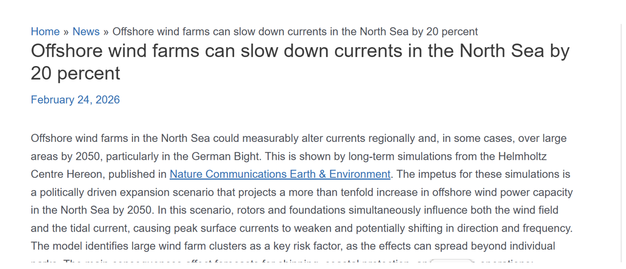 Une étude récente du Centre Helmholtz Hereon révèle les conséquences dramatiques du développement massif prévu des parcs éoliens en mer. La production d'énergie éolienne en mer du Nord devrait être multipliée par plus de dix d'ici 2050, mais ces installations auront un impact considérable sur l'hydrodynamique. Les simulations montrent que les rotors et les fondations atténuent les courants naturels jusqu'à 20 %. Il se crée ainsi un « mur » artificiel, les sédiments ne sont plus évacués, la surface de l'eau se réchauffe et la turbulence et le mélange augmentent anormalement. La stratification des eaux chaudes et froides se décale jusqu'à deux mètres en été. Les conséquences pour l'écosystème marin sont imprévisibles : poissons, plantes et fonds marins tout entiers souffrent de ce déséquilibre. La mer du Nord se transforme de plus en plus en centrale électrique industrielle, avec des dommages potentiellement irréversibles. Les chercheurs soulignent que l'impact s'étend bien au-delà des limites géographiques des parcs eux-mêmes. Le sillage d'un parc éolien interagit avec celui de son voisin, créant une réaction en chaîne qui se propage à travers toute la mer du Nord. En Bretagne sud ( Belle-île/Groix/ Quiberon) et nord ( Baie de Morlaix) les projets de parcs proches des côtes auront un effet imprédictible et non maitrisable sur les courants côtiers et les déplacements des sédiments, mettant possiblement en péril des structures comme l'isthme de Quiberon et le tombolo de Gâvres. Stop maintenant !