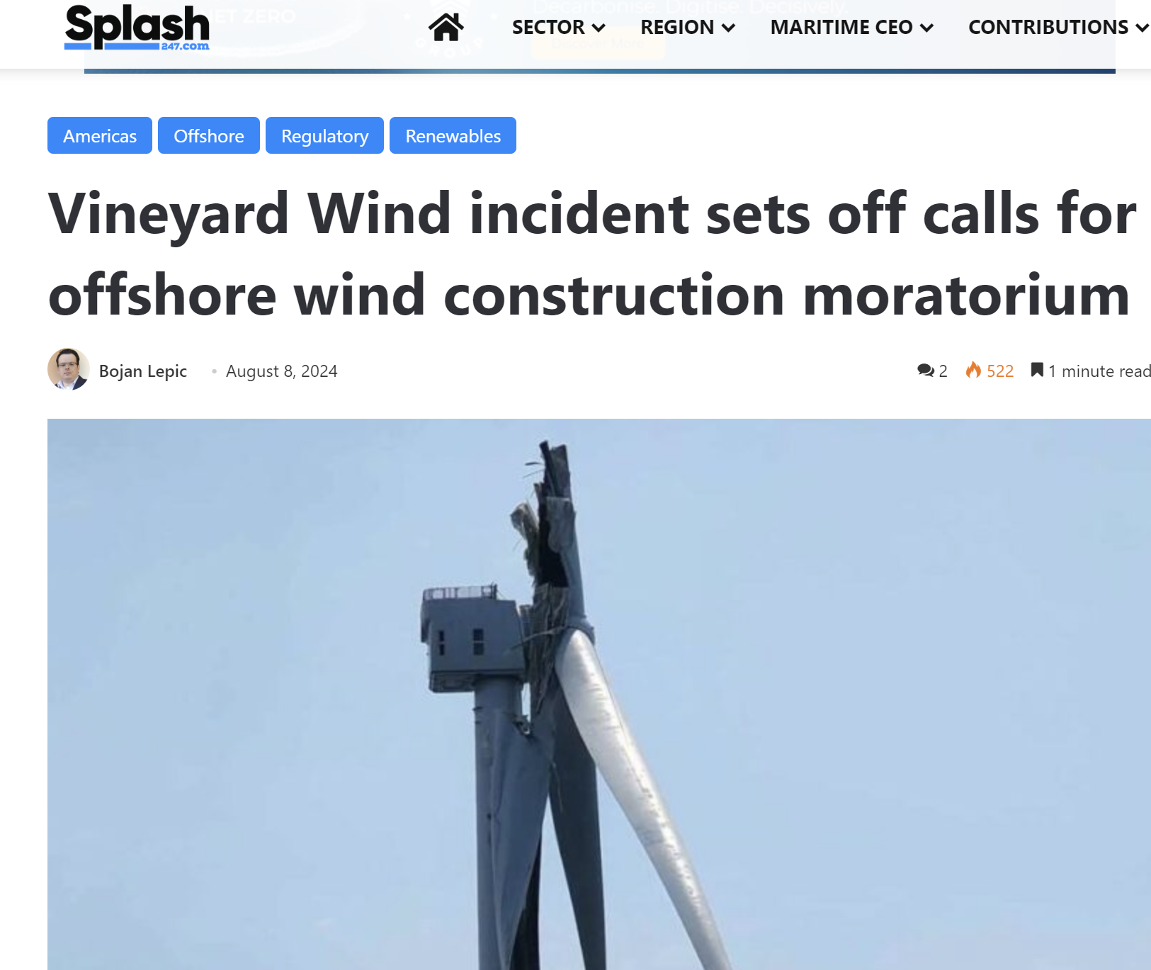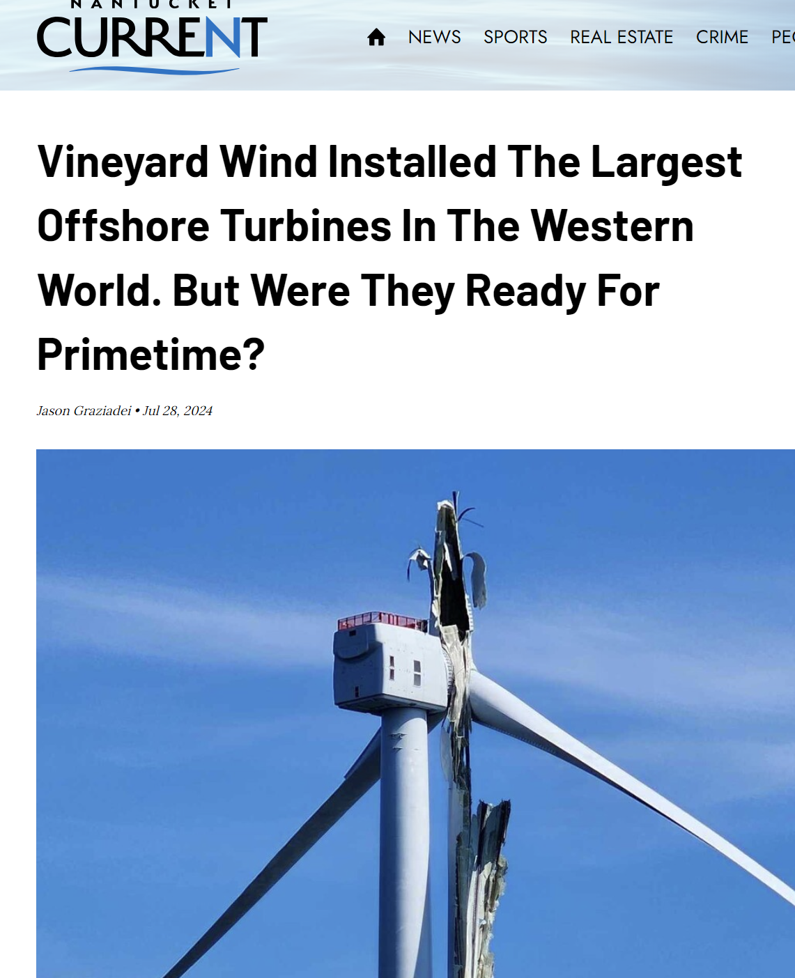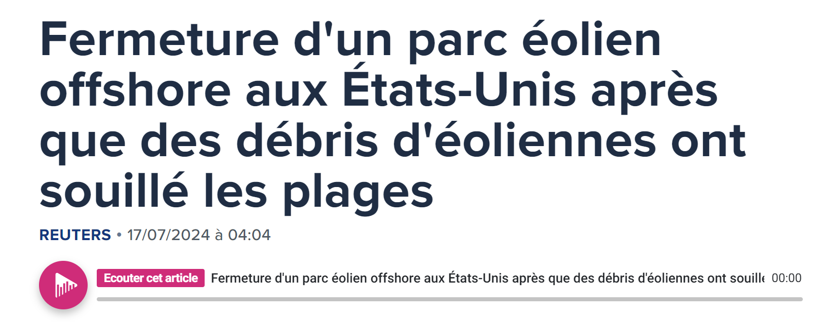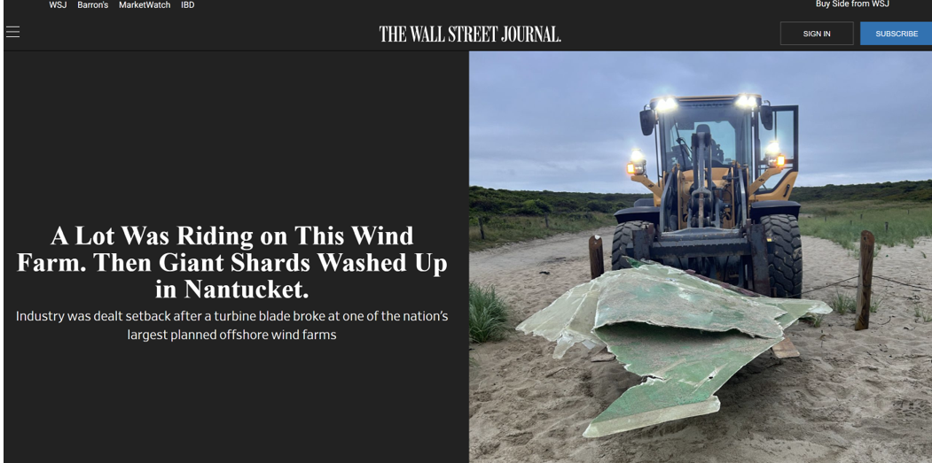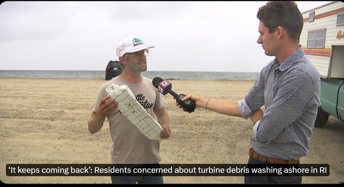 Le 13 juillet 2024, la rupture d'une seule pale d'une seule éolienne de la zone industrielle éolienne de Vineyard Wind 1, a provoqué la dispersion de milliers de débris jusqu'à 50 miles le long des côtes de l'île de Nantucket, un des plus prestigieux site maritime des USA. Bilan : des milliers de débris dangereux dans le mer et sur les côtes, pêche arrêtée, plages interdite, arrêt des travaux de Vineyard 1, les pêcheurs particulièrement inquiets et remontés : risques pour leur sécurité, de pollution, perte d'exploitation ( cf notre fil d'actu Une seule pale…Nantucket, un avertissement sur les désastres écologiques et économiques de l'éolien en mer lien