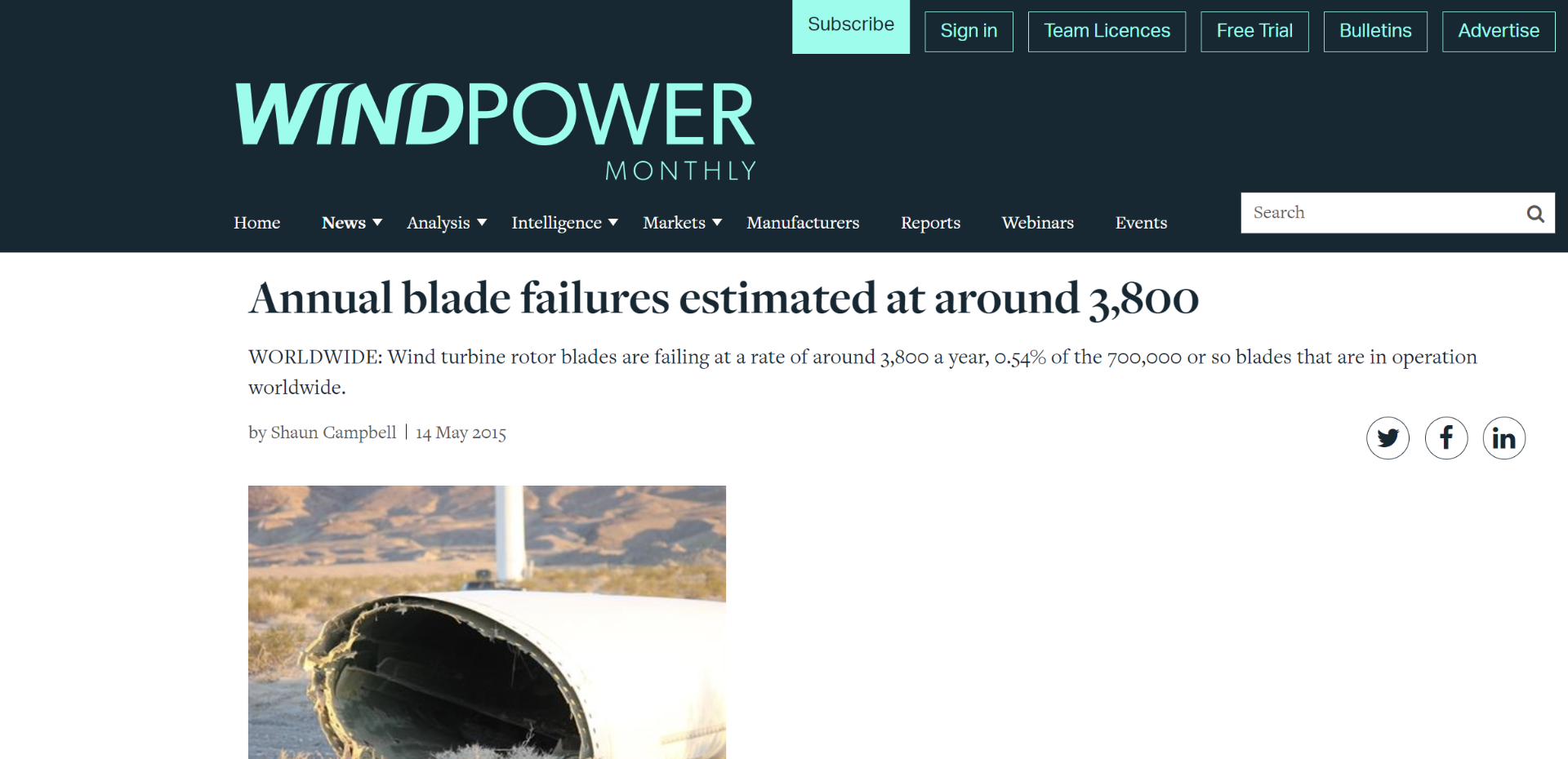 Or ces ruptures de pales ne sont pas rares, même si les statistiques le sont : en 2014, Windpower monthly les estimaient annuellement à 3800 (éolien terrestre et offshore) pour 700 000 pales en service dans le monde (chiffres GCube), soit 0,54 % de défaillance par an. Les défaillances des pales sont la principale cause de réclamations d'assurance sur le marché onshore américain, représentant plus de 40% des sinistres. L'industrie éolienne est également confrontée à une lutte pour obtenir les matériaux en fibre de carbone dont elle a besoin pour concevoir des pales plus légères et plus solides : « il y a une concurrence pour ces matériaux de la part des industries de l'automobile et de l'aérospatiale et ils sont prêts à payer très cher ! » A cela s'ajoute le fait que les turbines, les pales et les composants ne seraient pas testés de manière adéquate pour toutes les conditions météorologiques ; accélération des process et des procédures est antonyme de sécurité !