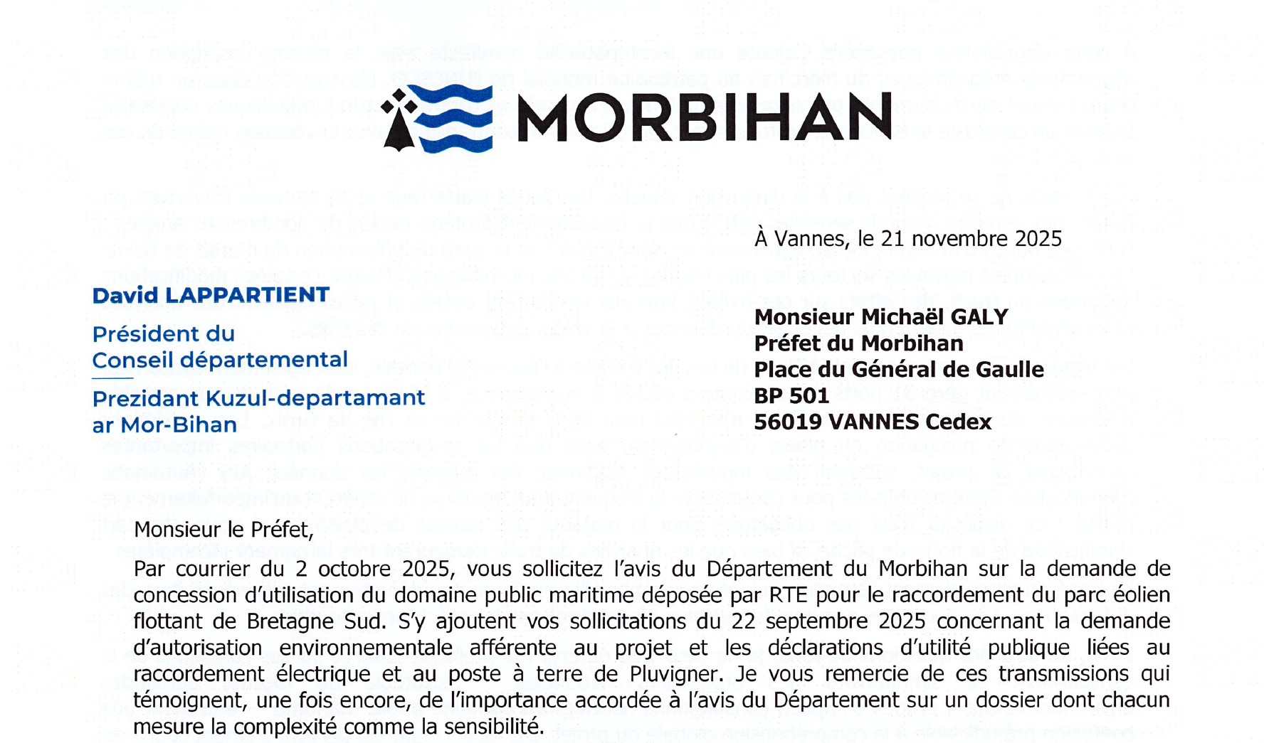 « Par courrier du 2 octobre 2025, vous sollicitez l'avis du Département du Morbihan sur la demande de concession d'utilisation du domaine public maritime déposée par RTE pour le raccordement du parc éolien flottant de Bretagne Sud. S'y ajoutent vos sollicitations du 22 septembre 2025 concernant la demande d'autorisation environnementale afférente au projet et les déclarations d'utilité publique liées au raccordement électrique et au poste à terre de Pluvigner. Je vous remercie de ces transmissions qui témoignent, une fois encore, de l'importance accordée à l'avis du Département sur un dossier dont chacun mesure la complexité comme la sensibilité. »