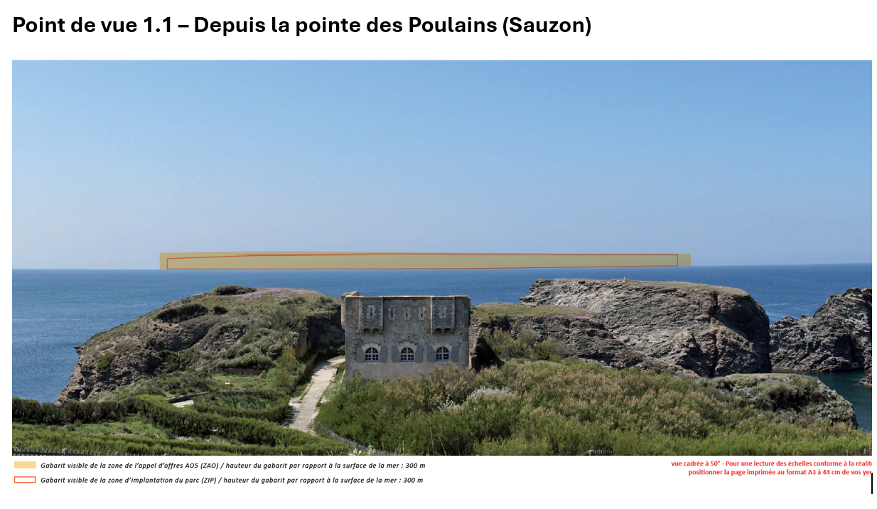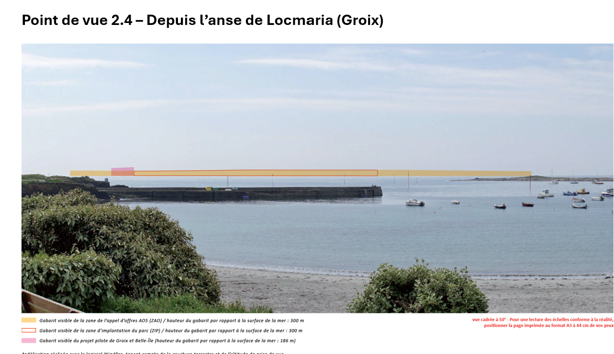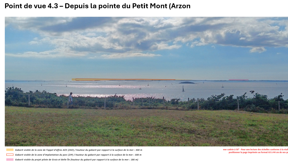 Plus préoccupant encore, la méthodologie employée pour évaluer cet impact apparaît lacunaire. Les photomontages disponibles se fondent sur un parc de 39 éoliennes de 319,5 mètres de hauteur, alors que l'étude d'impact mentionne désormais 48 éoliennes atteignant 380 mètres ! Une telle différence - près de 60 mètres supplémentaires - bouleverse l'ensemble des échelles paysagères et invalide les projections initiales. Ces hauteurs hors normes, sans équivalent en France, excèdent largement celles des parcs de Saint-Brieuc (207 m à 16 km) ou de Saint-Nazaire (180 m à 12 à 20 km). A 380 mètres, les éoliennes ne seraient pas seulement visibles: elles domineraient l'horizon maritime et imposeraient une présence industrielle sans commune mesure avec les paysages protégés du littoral morbihannais.