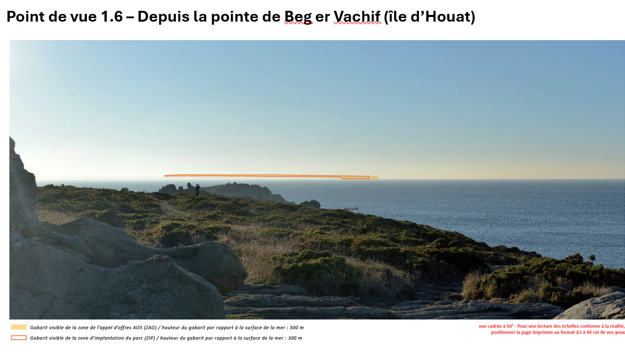 « L'analyse des documents révèle en effet que quatorze unités paysagères reconnues pour leur intérêt patrimonial, inscrites, classées ou protégées au titre de Natura 2000, seraient directement affectées par des atteintes visuelles majeures. Ces impacts seraient irréversibles. Les photomontages produits, pour certains depuis des sites emblématiques comme les Aiguilles de Port-Coton, la pointe des Poulains, Port de Donnant ou encore le tumulus Saint-Michel, montrent de manière indiscutable que les ouvrages seraient visibles depuis les panoramas les plus remarquables de Belle-Île-en-Mer, de Groix, d'Houat et d'Hoëdic. Les paysages concernés, d'une qualité exceptionnelle et constitutifs de l'identité même du Morbihan, se trouveraient durablement modifiés et altérés. »