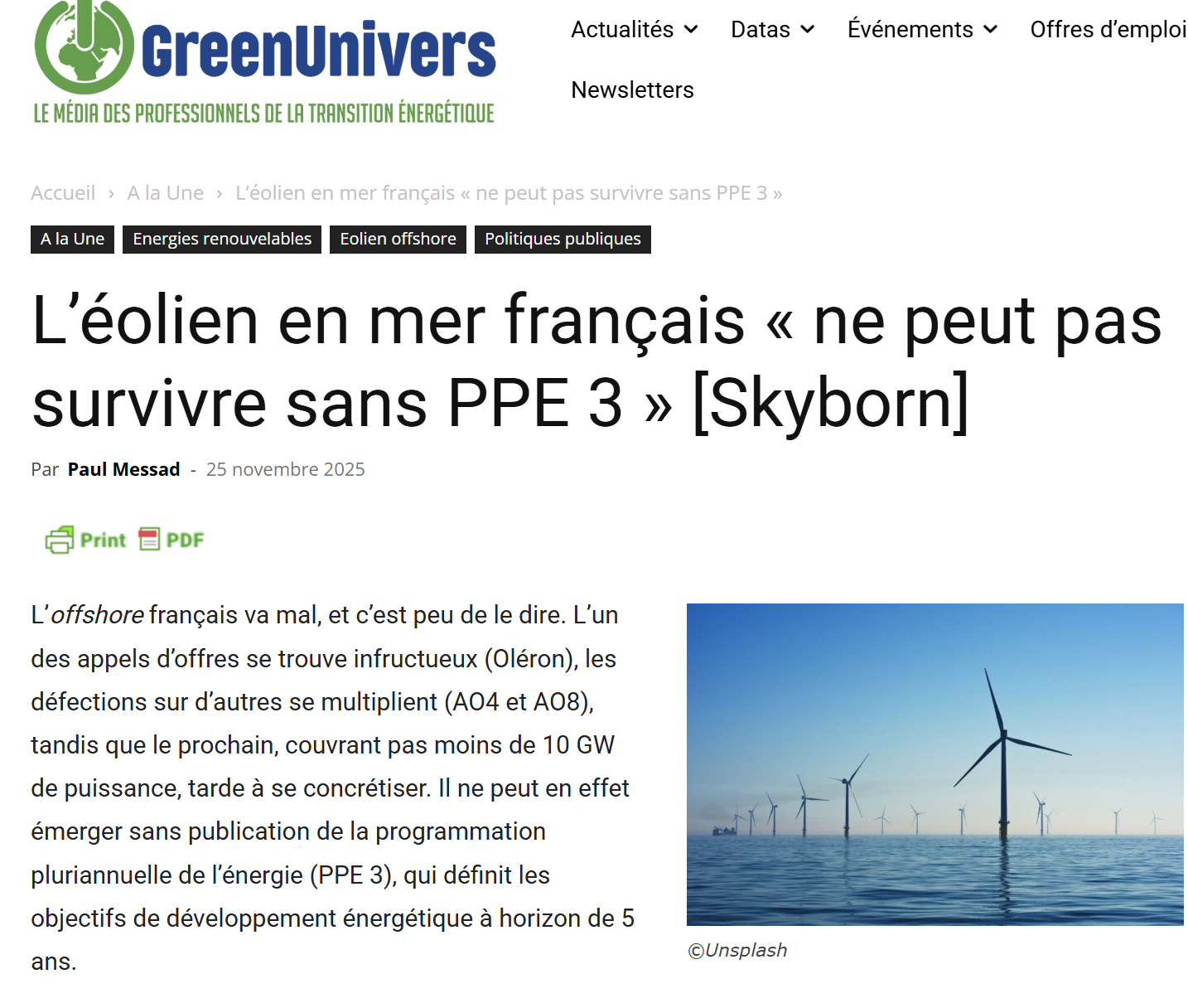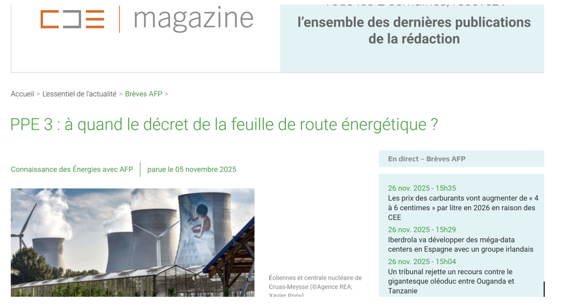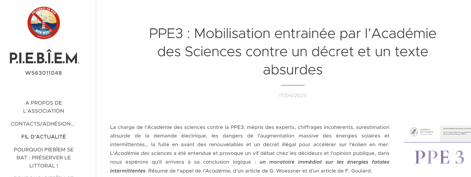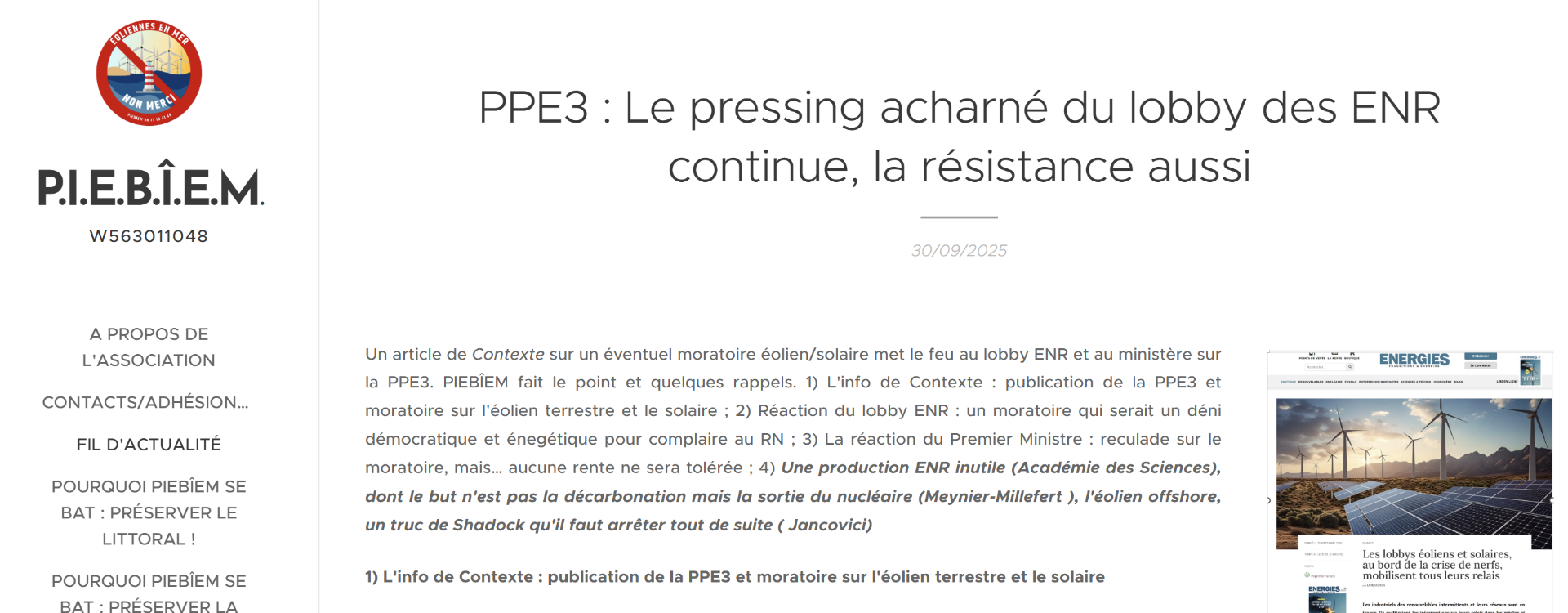 L'actualité sur la PPE3 revient en trombe. Le ministre de l'énergie vient de rappeler que la stratégie énergétique de la France est en tête des priorités du gouvernement et de celles du Premier ministre, et vise à publier ce texte sensible qui déchire la classe politique avant la fin l'année lien ; Le lobby éolien en mer français pousse très fort, avec cet aveu extraordinaire : il ne peut pas survivre sans la PPE3, entendre sans les aides, subventions et contrats juteux qu'il espère lien . Enfin RTE prend au moins partiellement en compte les préconisations de l'Académie des Sciences et revoit sensiblement à la baisse ses projections de demande électrique lien : pas besoin de production électrique supplémentaire d'ici 2035, surtout intermittente-. PIEBÎEM refait le point sur la PPE3 et ses nombreuses interventions dans le débat public et auprès des décideurs.